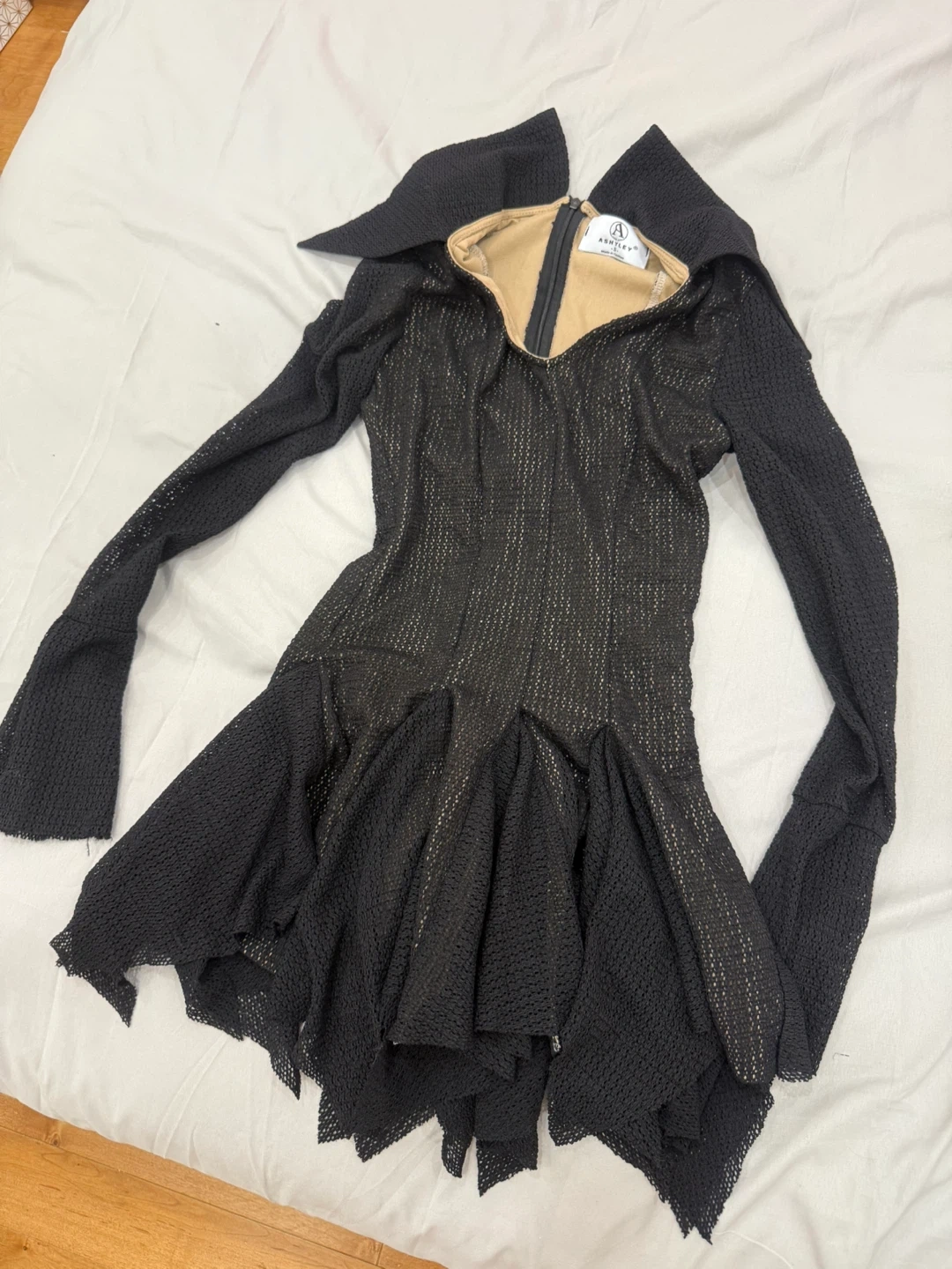 This is a lovely black dress from Ashley Stewart! It features long sleeves and a unique design. Perfect for a night out or a special occasion