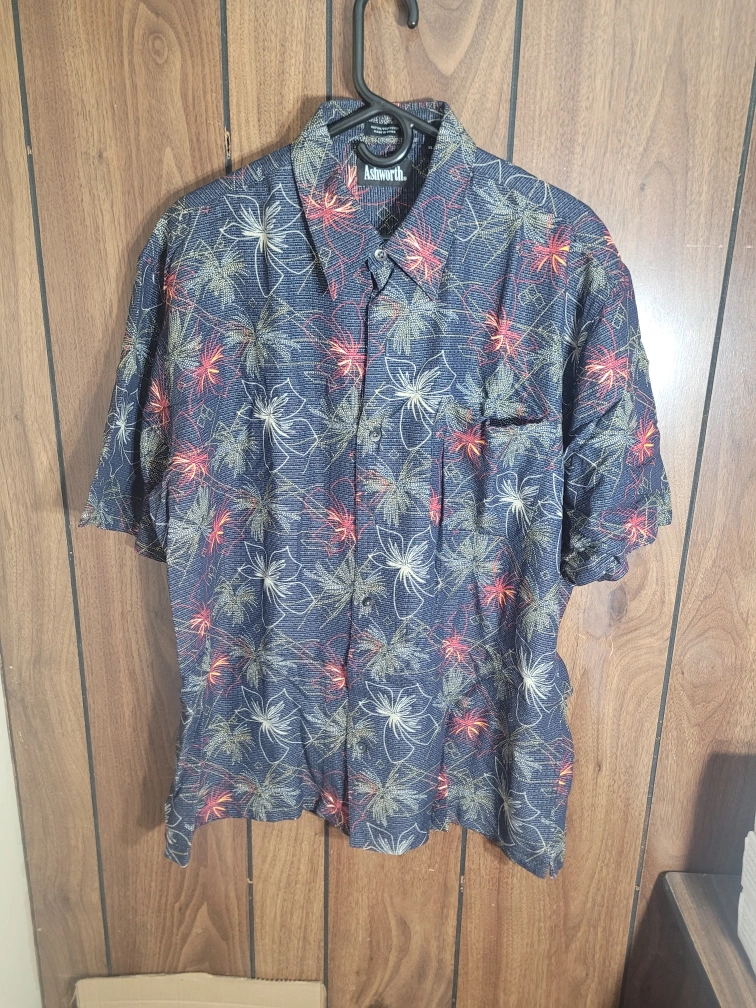197Looking to pass along this Ashworth button-down shirt in size XL! It features a cool floral pattern in shades of blue, red, and gold. Perfect for adding a bit of flair to your wardrobe!