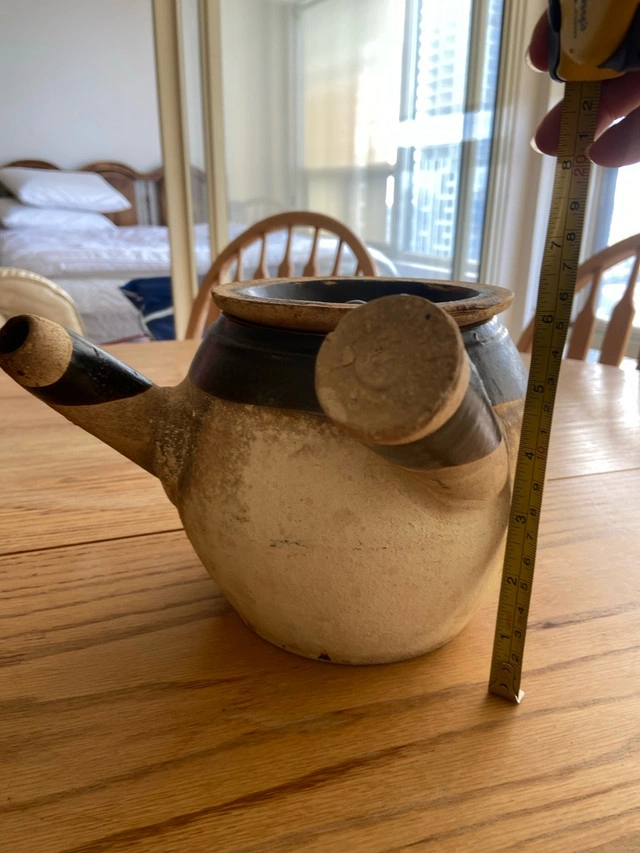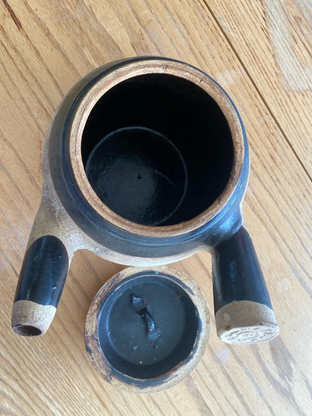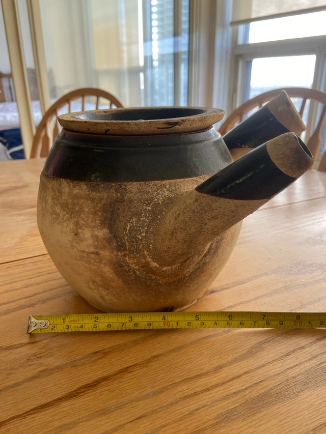 This captivating Asian Clay cooking pot with its unique design featuring one spout and a handle. Its earthy tones and rustic charm tell a story of tradition and craftsmanship. Given its age, the pot shows signs of wear that only add to its character. Key features: - Rustic, earthy aesthetic - Ideal for collectors or as a decorative piece - Dimensions: Approximately 8 inches wide x 8 inches tall