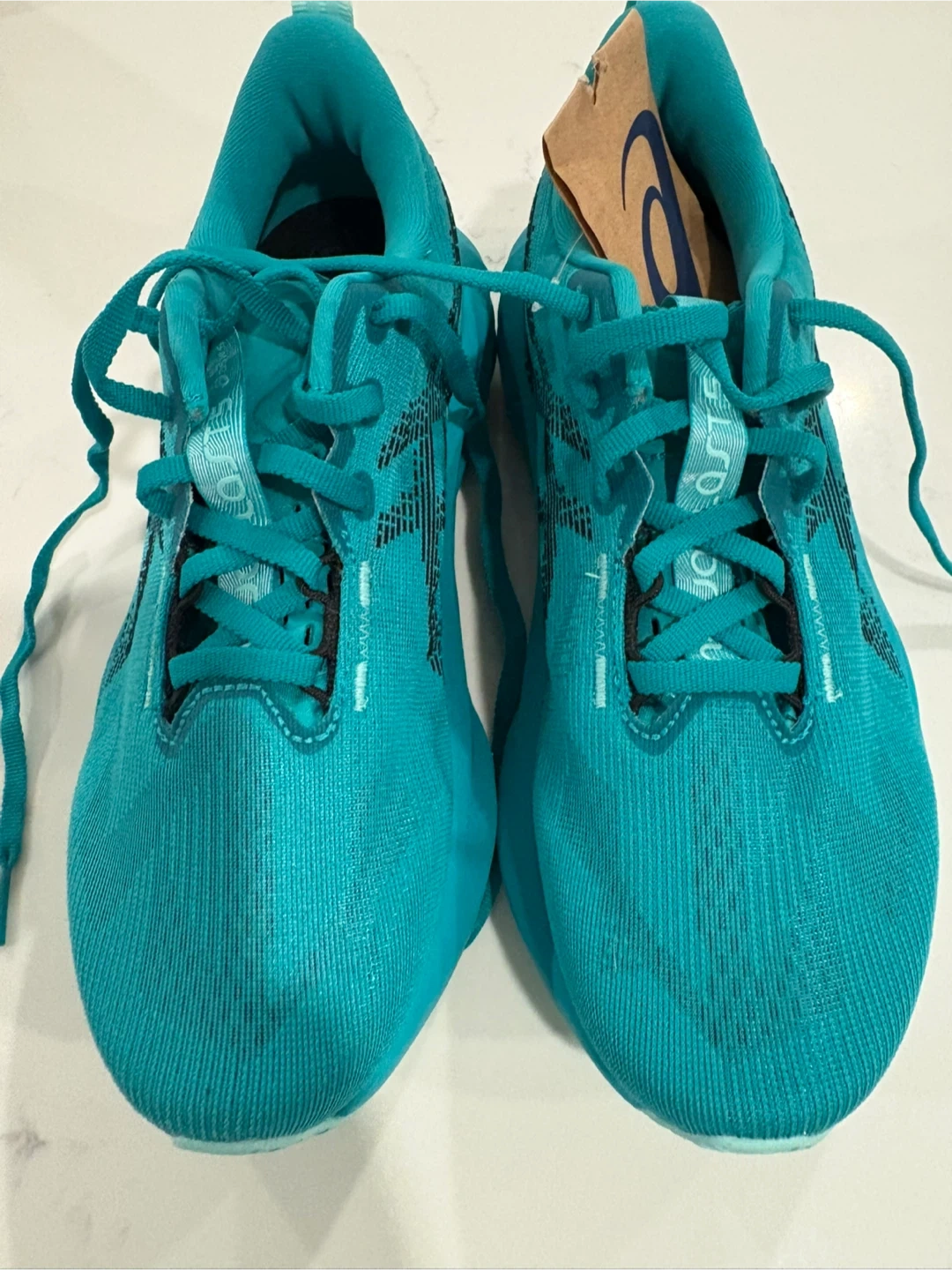 15Selling a pair of Asics Novablast 5 women's running shoes in a vibrant turquoise colour! They are a size 8. These bouncer trainers provide a responsive energy return for your runs. Originally priced at $150.00!
