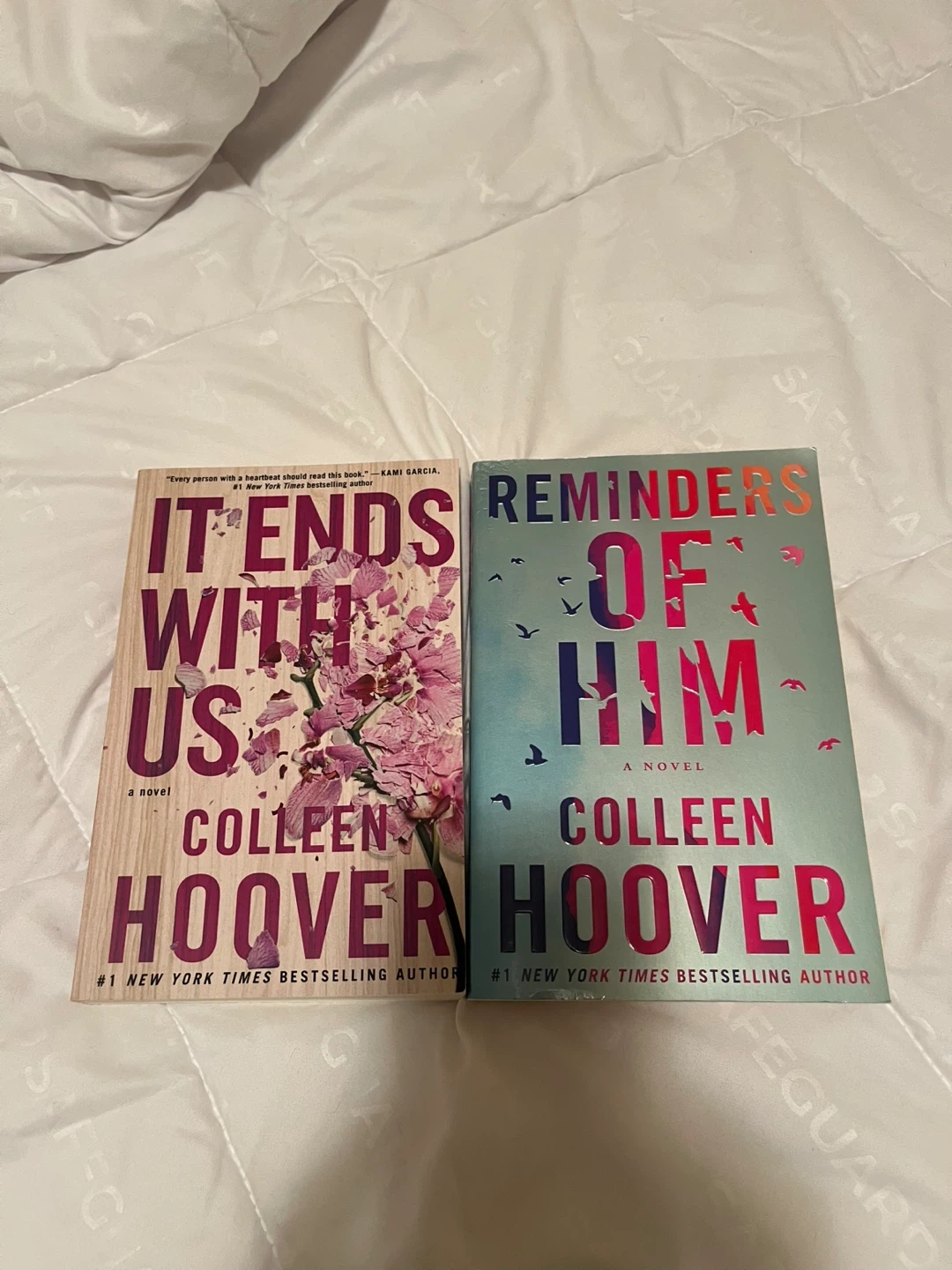 Two novels by Colleen Hoover: 'It Ends With Us' and 'Reminders of Him'. Both are paperback editions and #1 New York Times Bestselling Author titles. These are gripping stories exploring complex relationships and personal journeys.