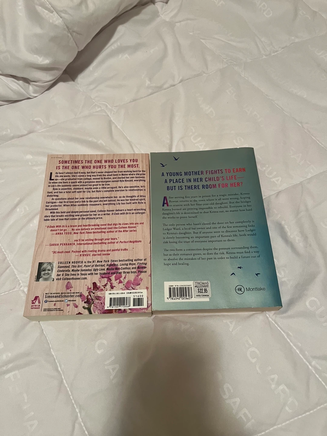 Two novels by Colleen Hoover: 'It Ends With Us' and 'Reminders of Him'. Both are paperback editions and #1 New York Times Bestselling Author titles. These are gripping stories exploring complex relationships and personal journeys.