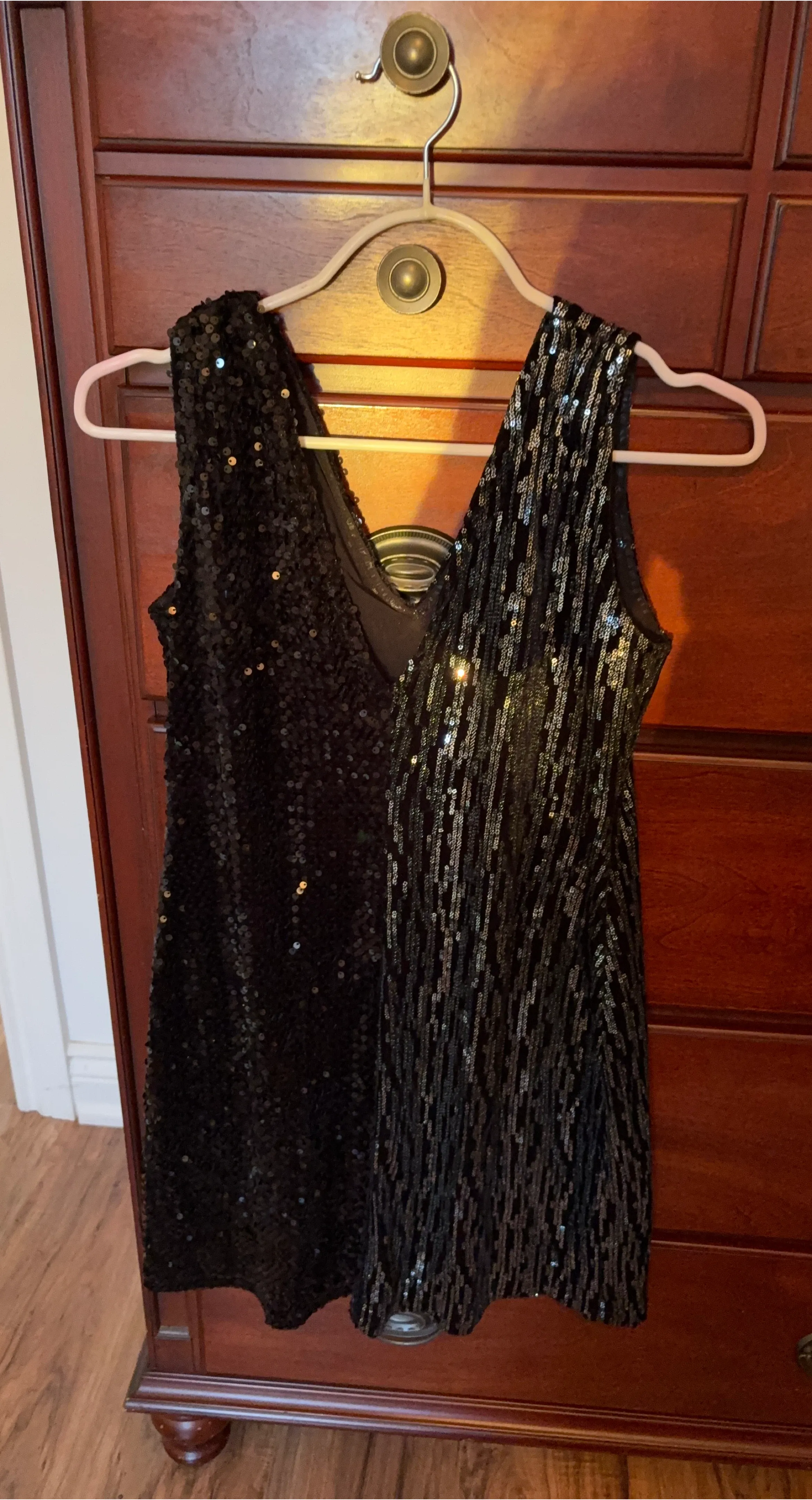 This black sequin sleeveless mini dress is perfect for a night out. It features a V-neckline and a flattering fit. The dress is fully lined.