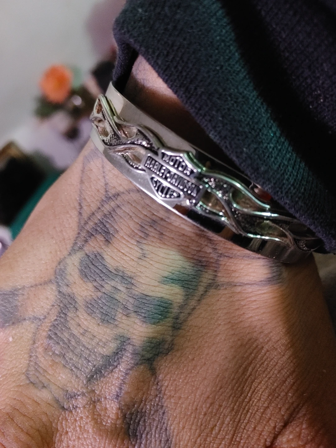 This stylish Harley-Davidson bangle bracelet features a flame design and the iconic Harley-Davidson logo. It's made of polished metal for a durable and eye-catching accessory. It's a great piece for any Harley enthusiast!
