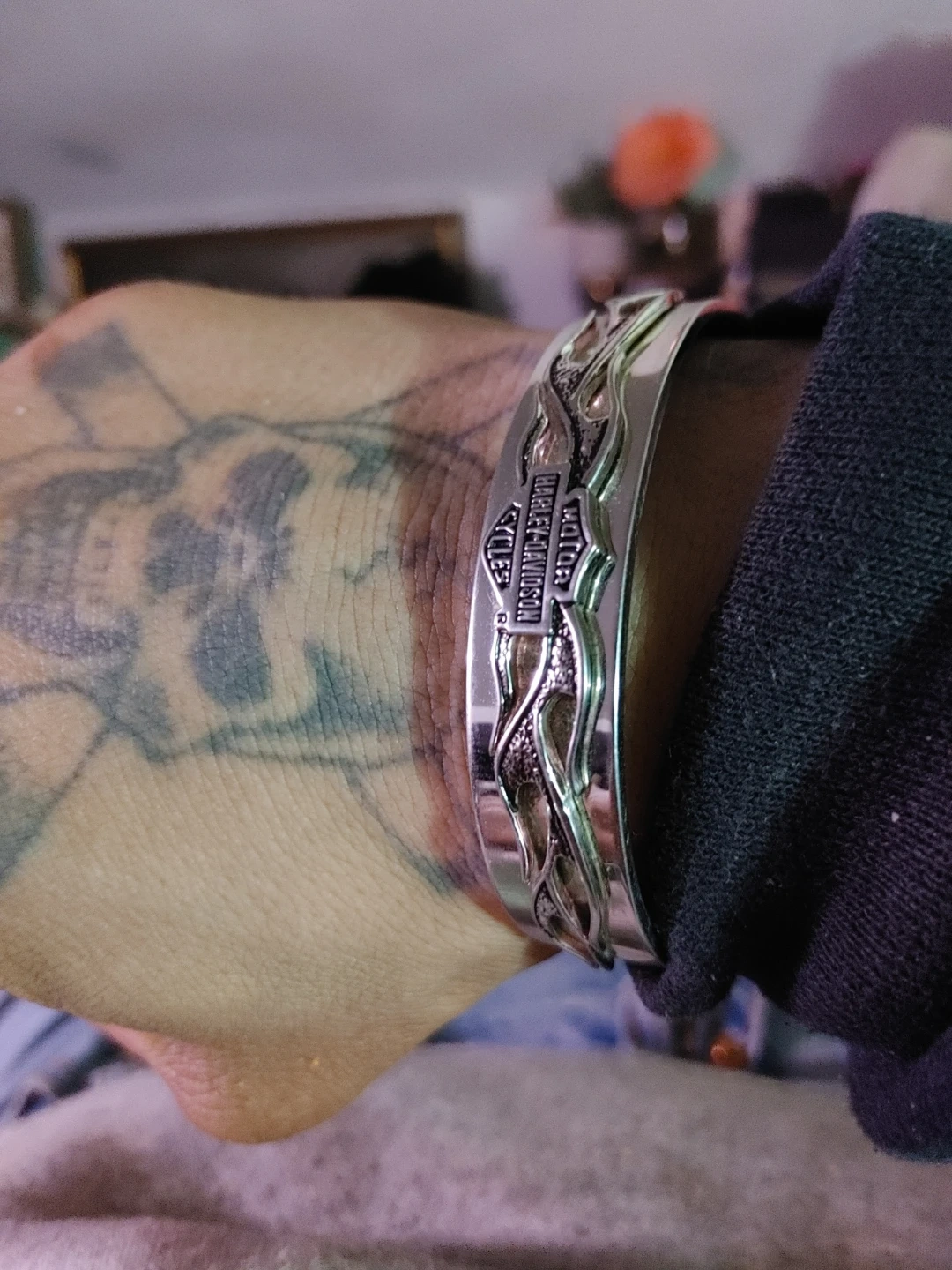 This stylish Harley-Davidson bangle bracelet features a flame design and the iconic Harley-Davidson logo. It's made of polished metal for a durable and eye-catching accessory. It's a great piece for any Harley enthusiast!