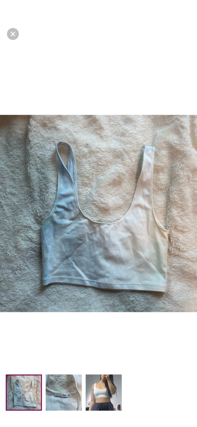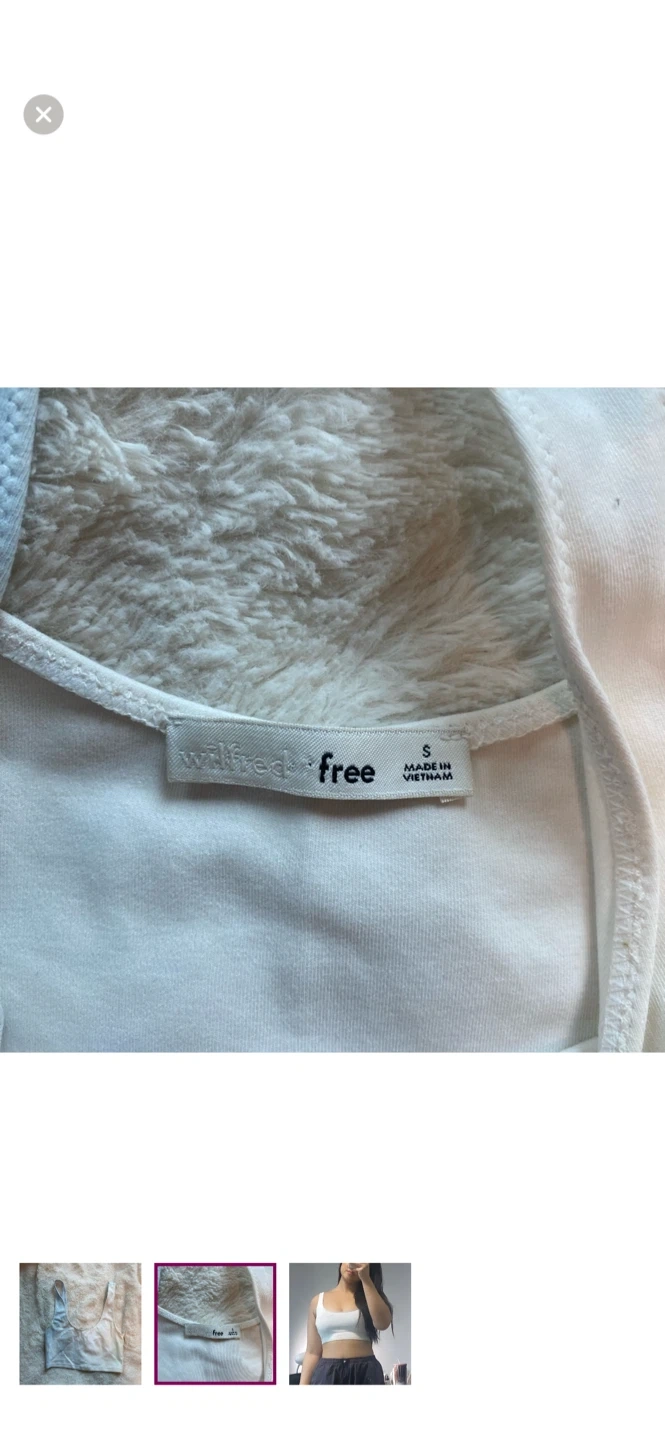 This is a Wilfred Free ribbed tank top. It's a size small with a white and blue tie-dye pattern. This tank top's fabric is ribbed. It would be useful for everyday wear.