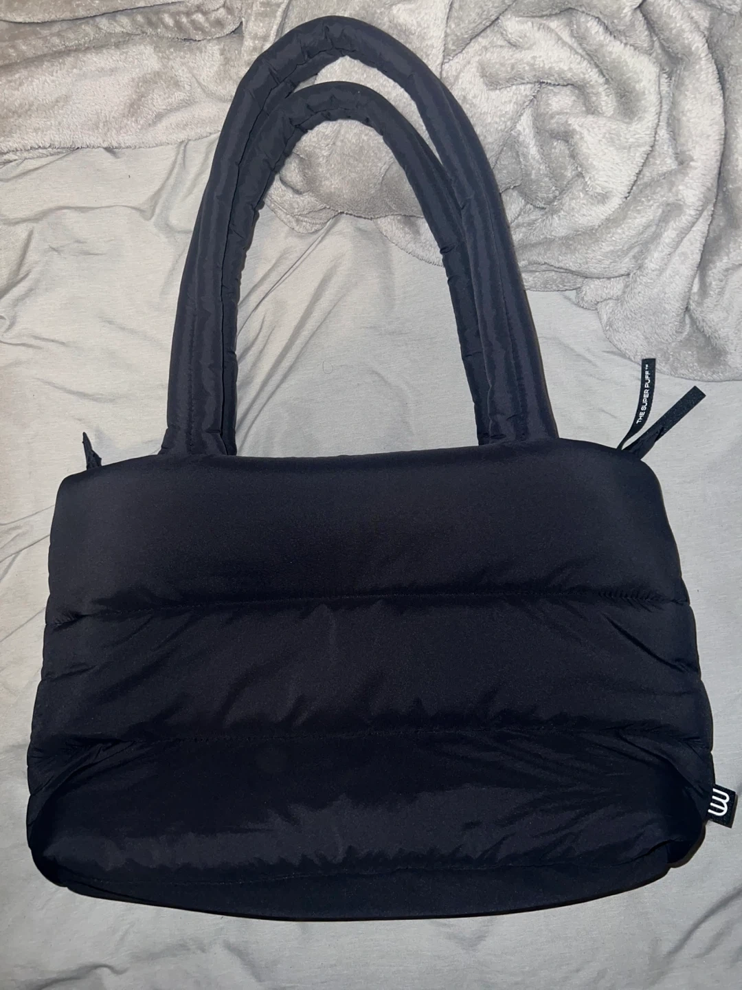 Selling an Aritzia Super Puff tote bag in black! It's in great condition and ready for a new owner. This stylish and practical tote is perfect for everyday use, with its lightweight and portable design. It's made of high-quality material and features a spacious interior. Feel free to reach out if you're interested