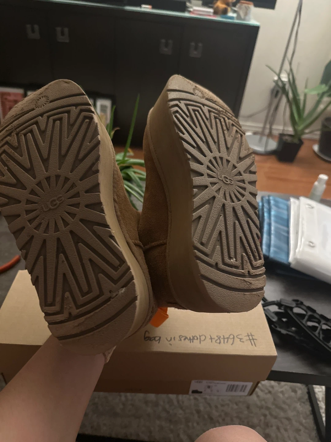 These UGG boots are made of brown suede with a platform sole. They're cozy and stylish for everyday wear. The boots have the classic UGG sole pattern on the bottom.