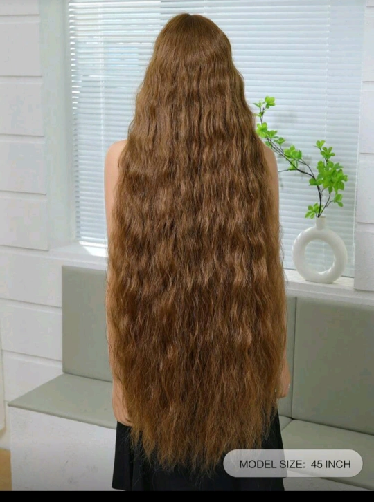 Selling a long, curly brown wig that's 45 inches in length. It's in great condition and ready for a new home! The wig has a lovely texture and is perfect for adding some extra length and volume to your hair