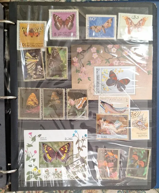 This listing includes a collection of assorted postage stamps featuring various butterfly designs. Stamps are from Mongolia, Oman, and other international locations. Some stamps are dated. They're in good condition and ready for collection.