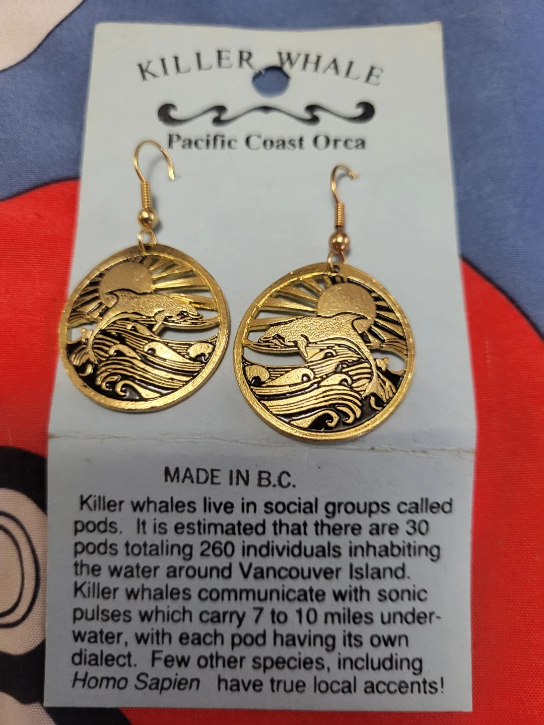 These dangle earrings feature a killer whale design with a sun and waves motif. They're made in B.C. and come on their original card. Great for anyone who loves marine wildlife!