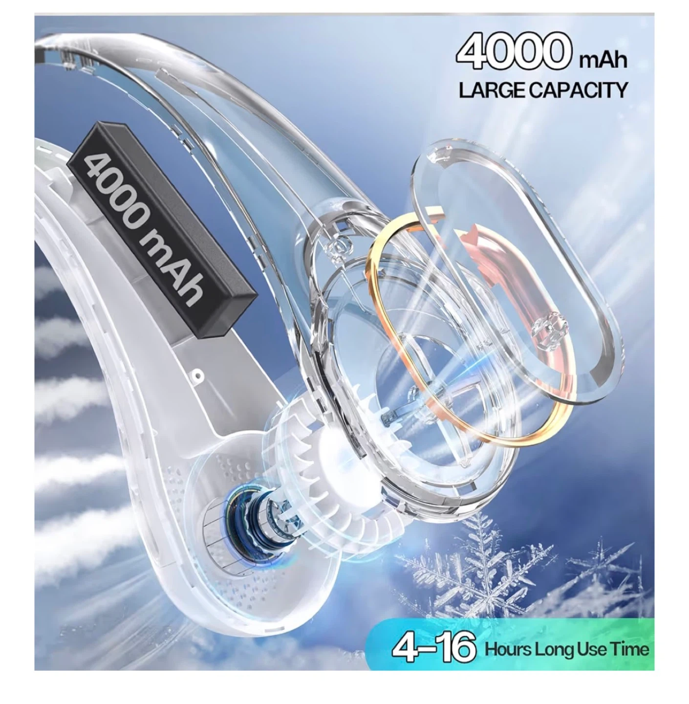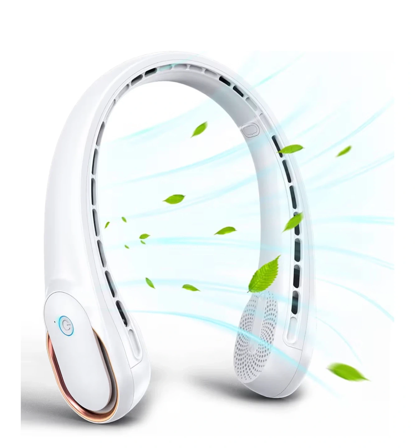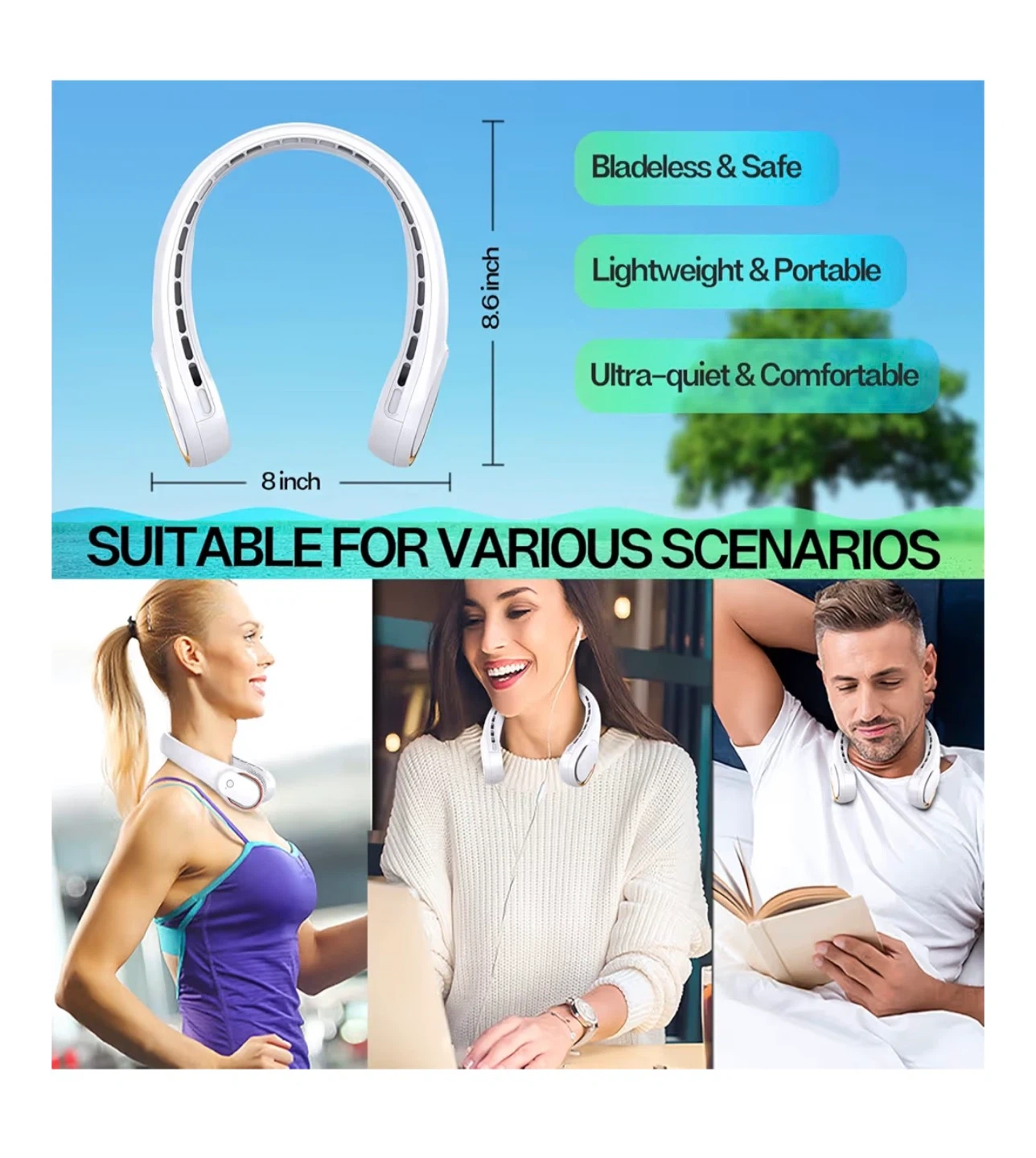 This bladeless neck fan is lightweight and portable. It offers ultra-quiet operation and 360-degree air movement for quick cooling. It has a large 4000 mAh capacity battery for 4-16 hours of use.