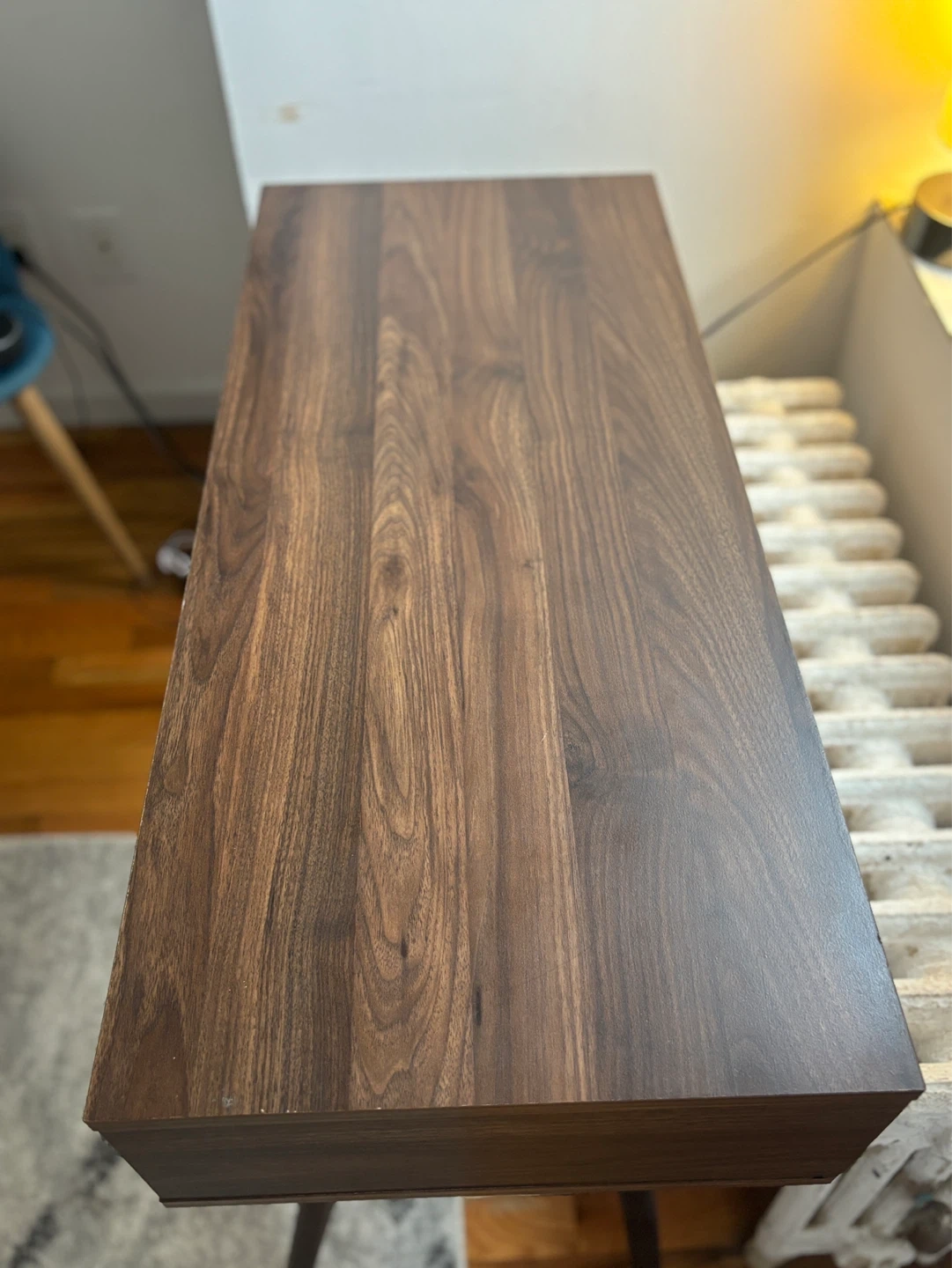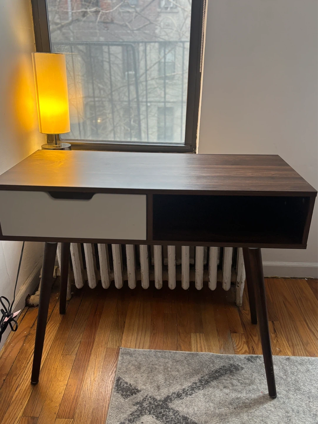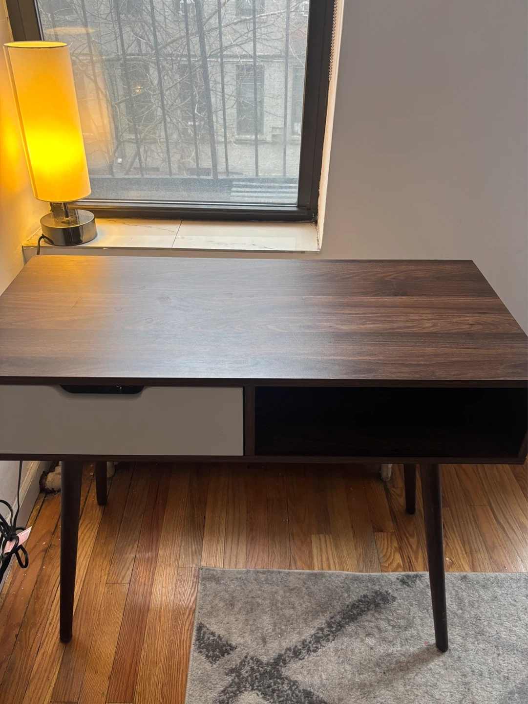 Selling a stylish dark wood desk that would look great in any home office or study space! It features a clean, modern design with a drawer and an open storage compartment. The desk is in great condition and ready for a new home!