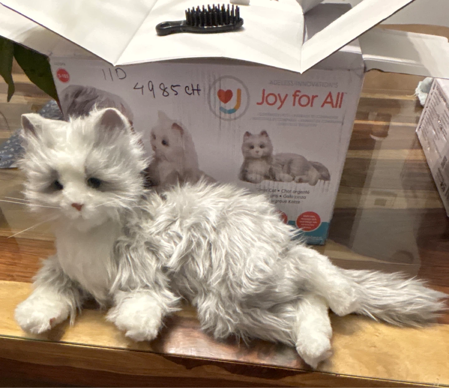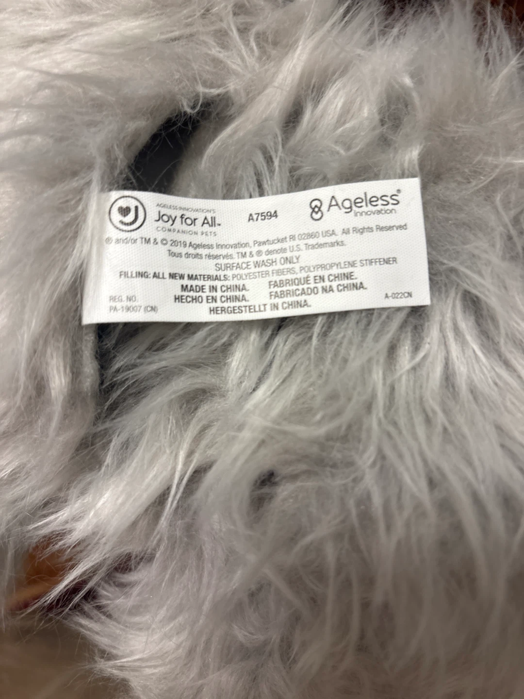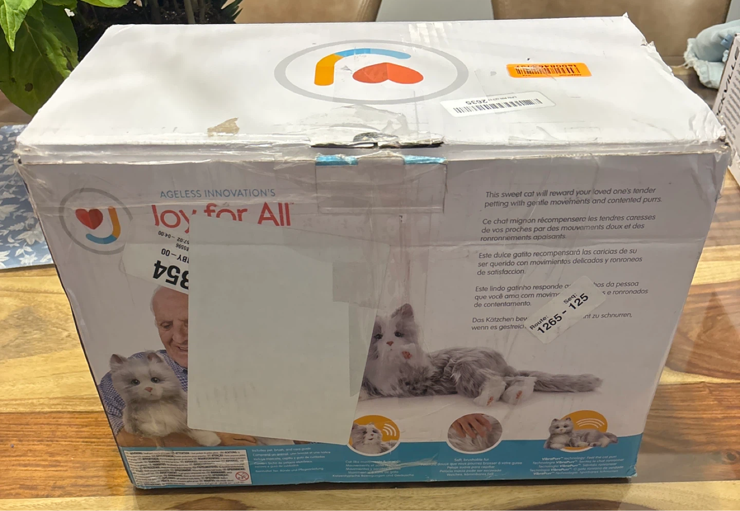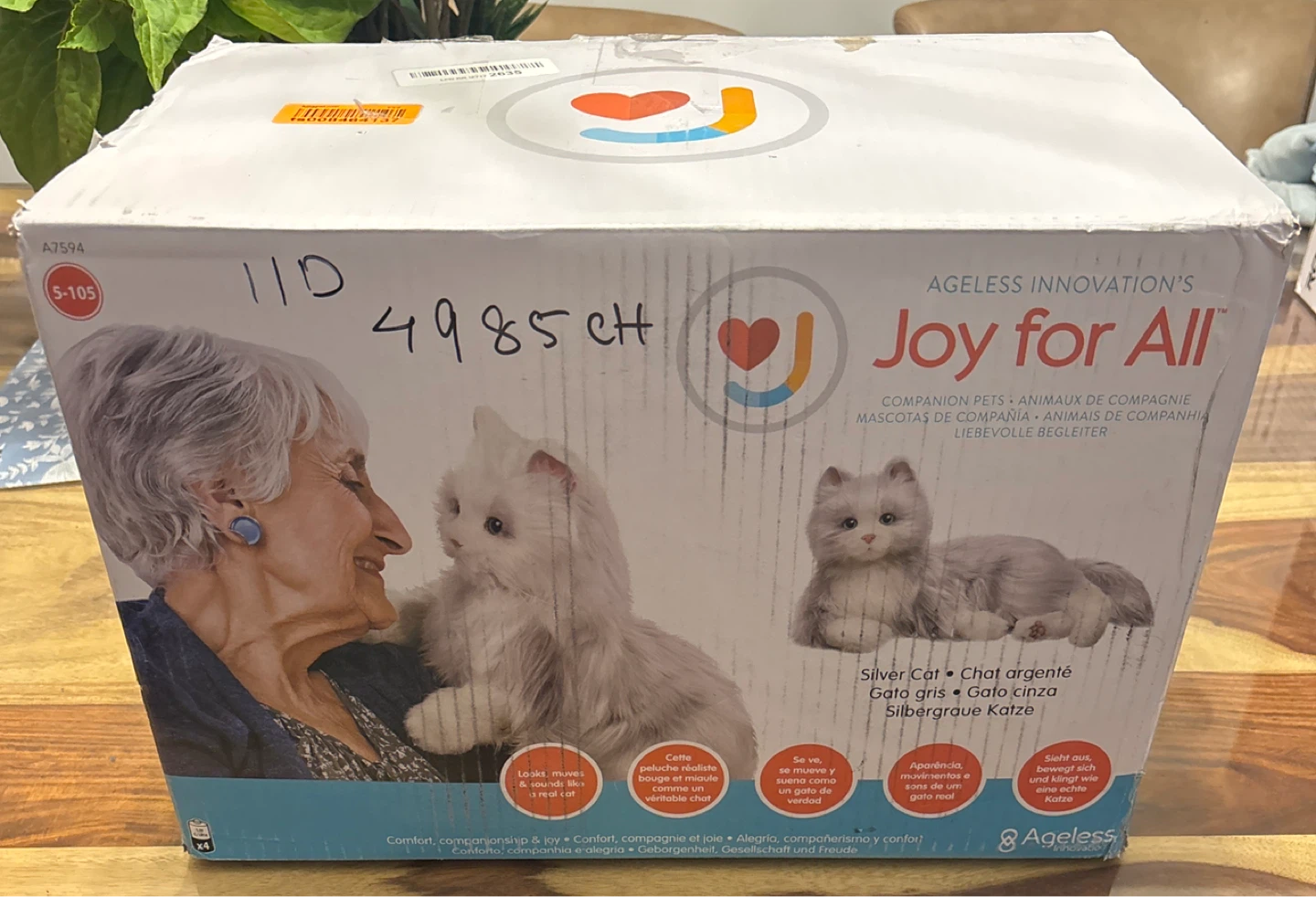 Selling an Ageless Innovation Joy for All companion pet cat. It's a silver cat and comes with its original box and a brush. This sweet cat will reward your loved one's tender petting with gentle movements and content purrs.