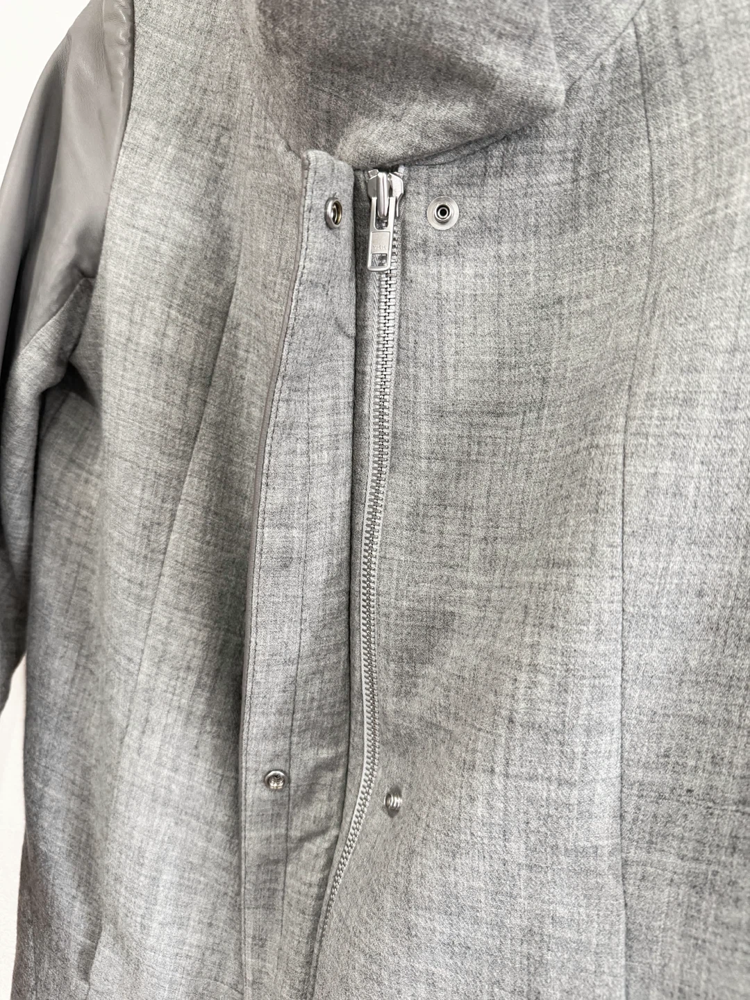 This Helmut Lang jacket features a wool blend body and contrasting leather sleeves. It has a unique funnel collar and a front zipper closure with snap button details. Silver-tone hardware throughout.