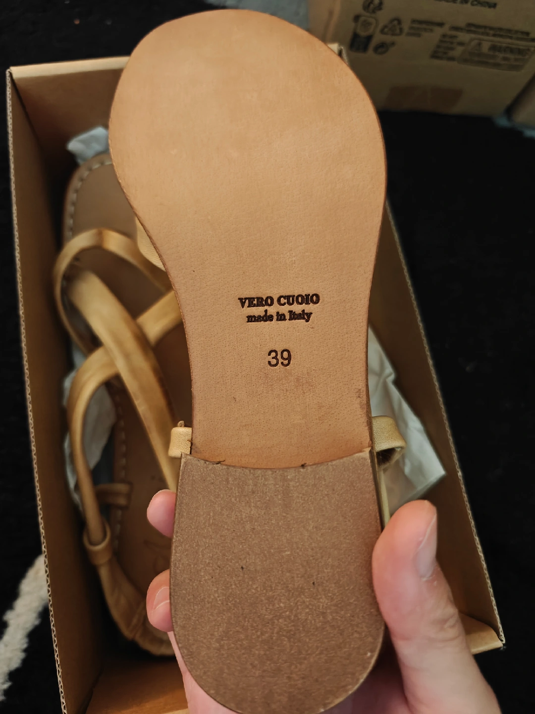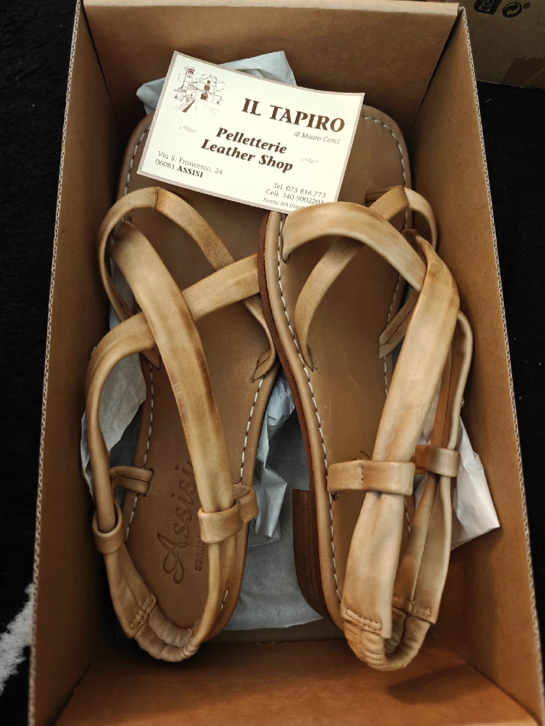 10Selling a pair of leather Assisi sandals in size 39. They come in their original box. The sandals are made in Italy with vero cuoio (real leather) soles