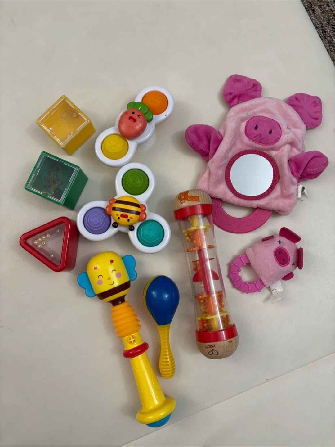 A collection of baby toys, including shape sorter blocks, a bee spinner, pig plush toy, maracas, and a Hape rainmaker toy! Great for sensory development and playtime for little ones!