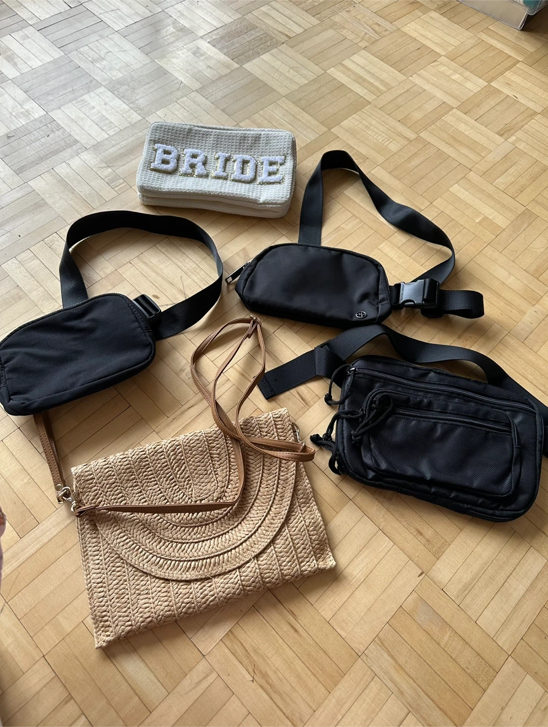 Assorted Bags: Straw Crossbody & Black Belt Bags