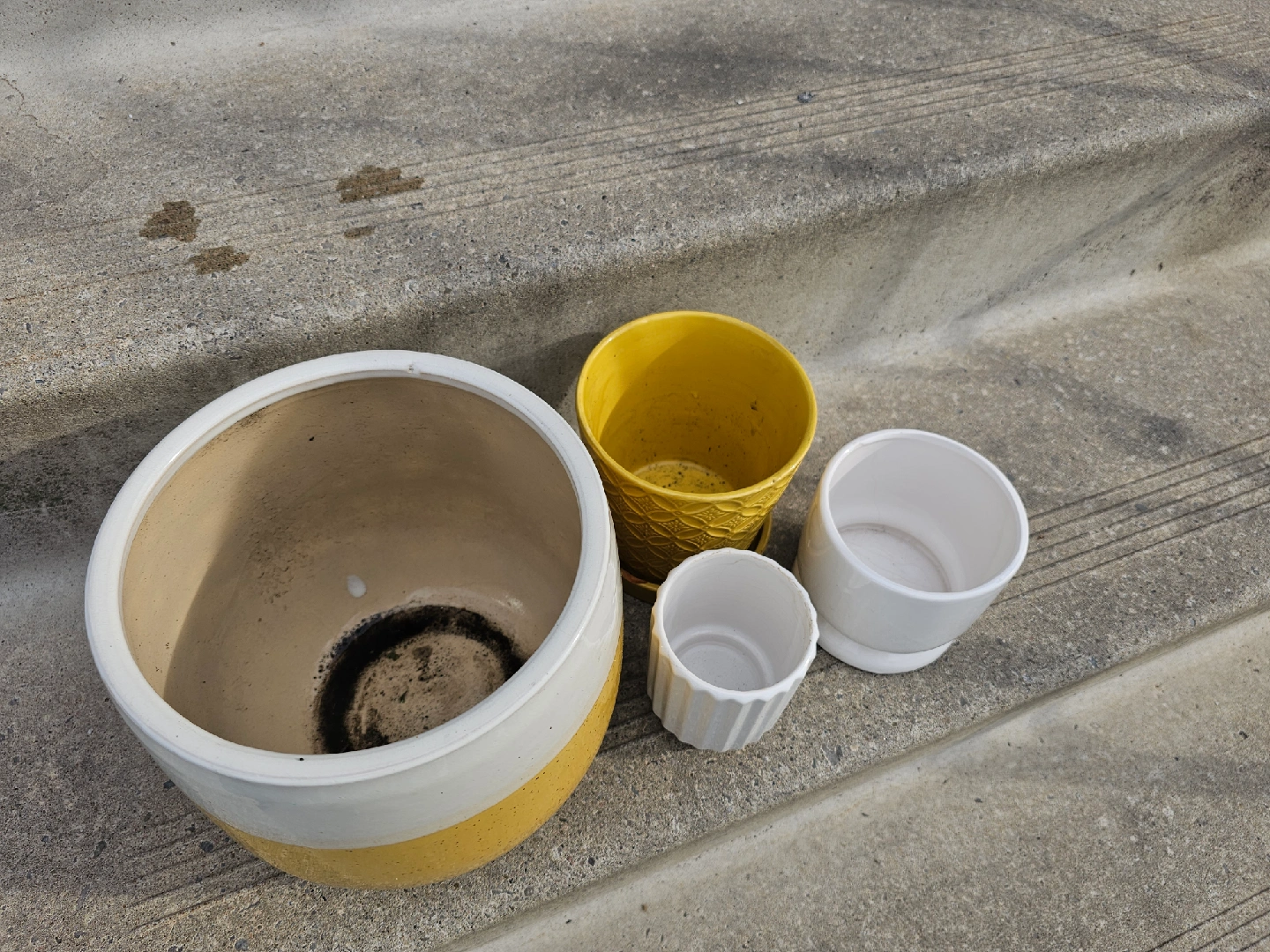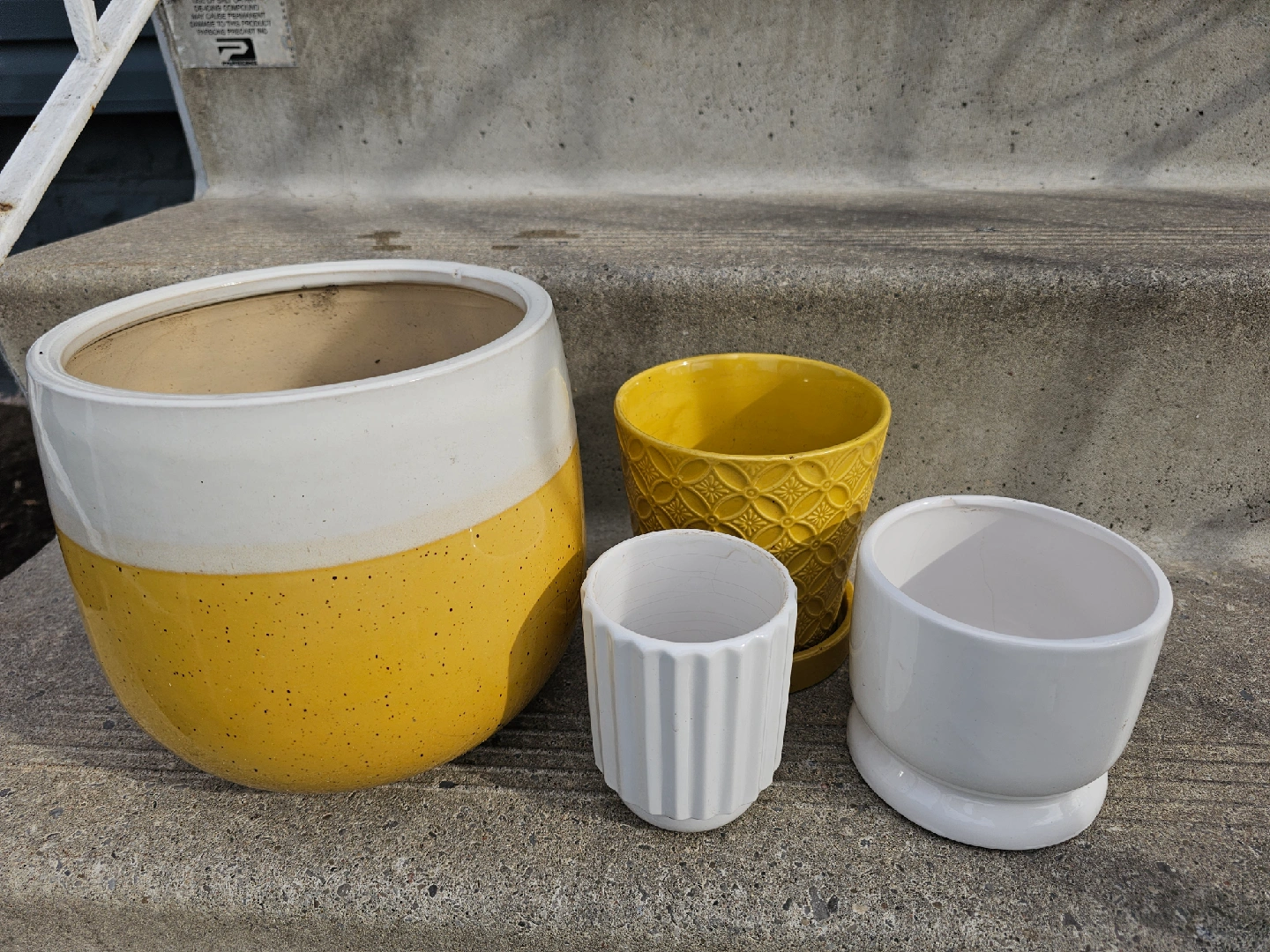 Selling a set of four assorted ceramic plant pots. They are in good condition and ready for your favourite plants. The set includes a large yellow and white pot, a smaller yellow patterned pot, a small white ribbed pot, and a white pot with a base. Perfect for adding some colour to your indoor or outdoor space! See my ad for the larger white one!