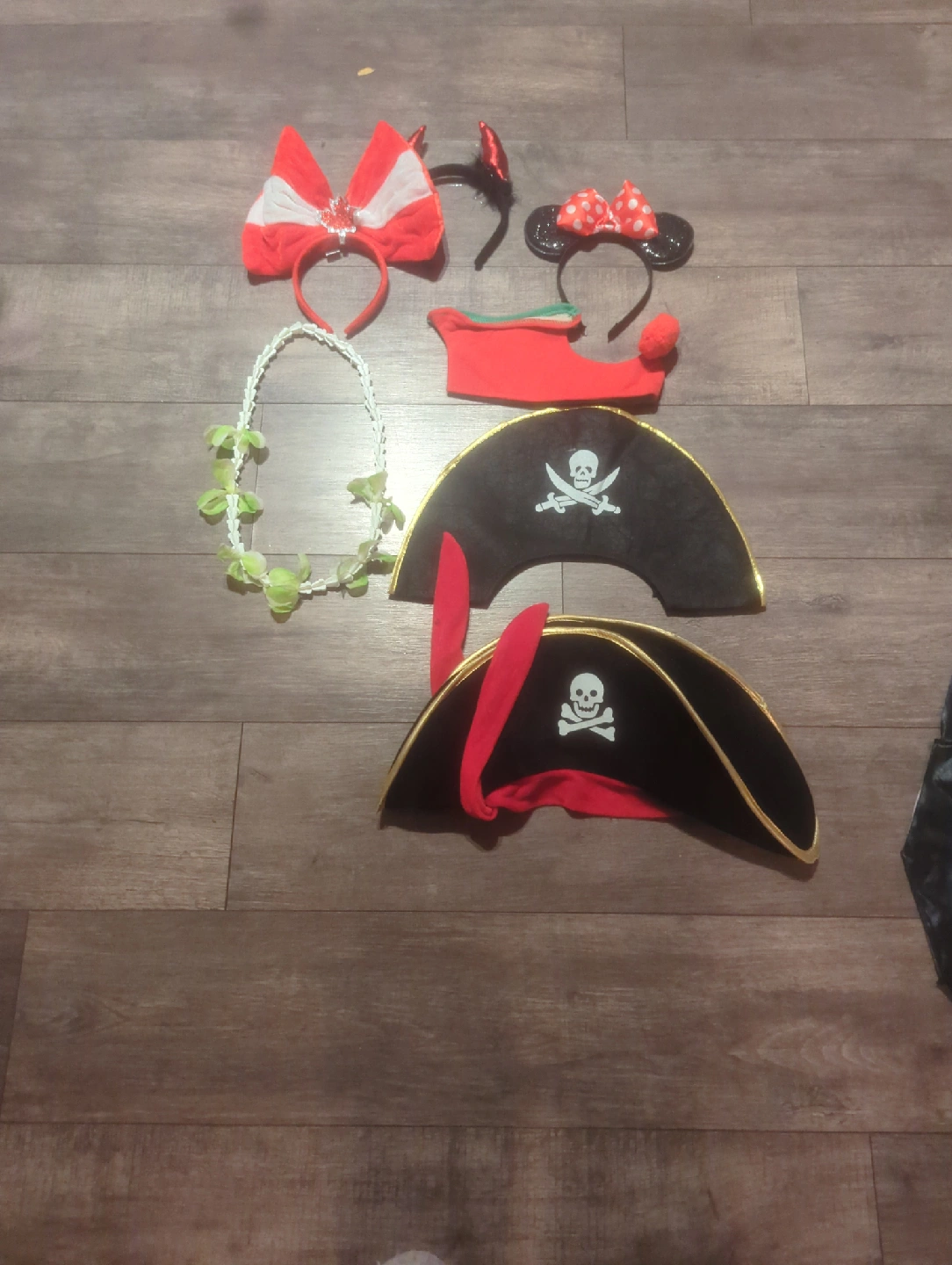 Selling a collection of fun costume accessories! Includes a Minnie Mouse headband, devil horns, a red and white bow headband, a pirate hat, and more. Perfect for dress-up or Halloween!