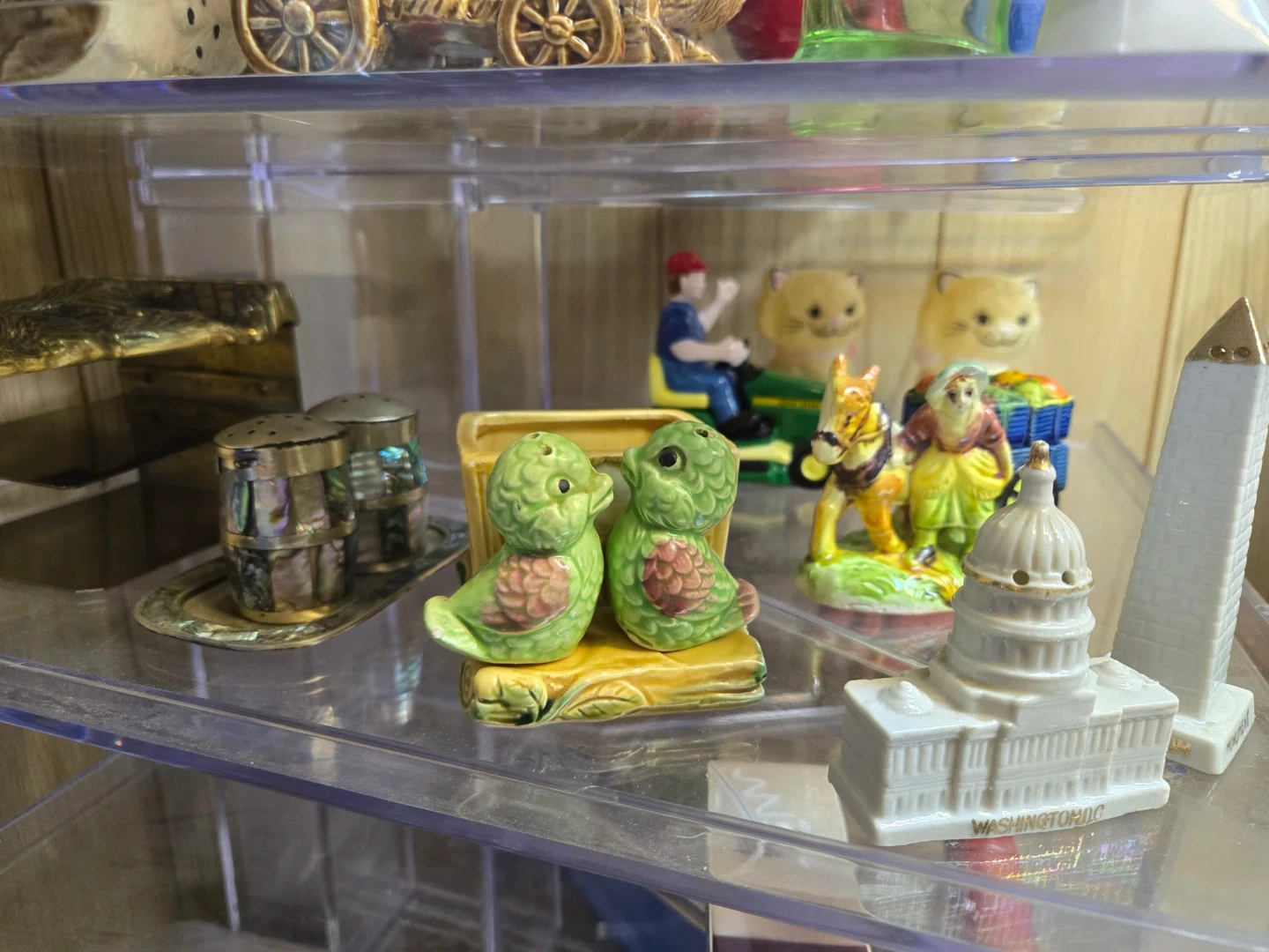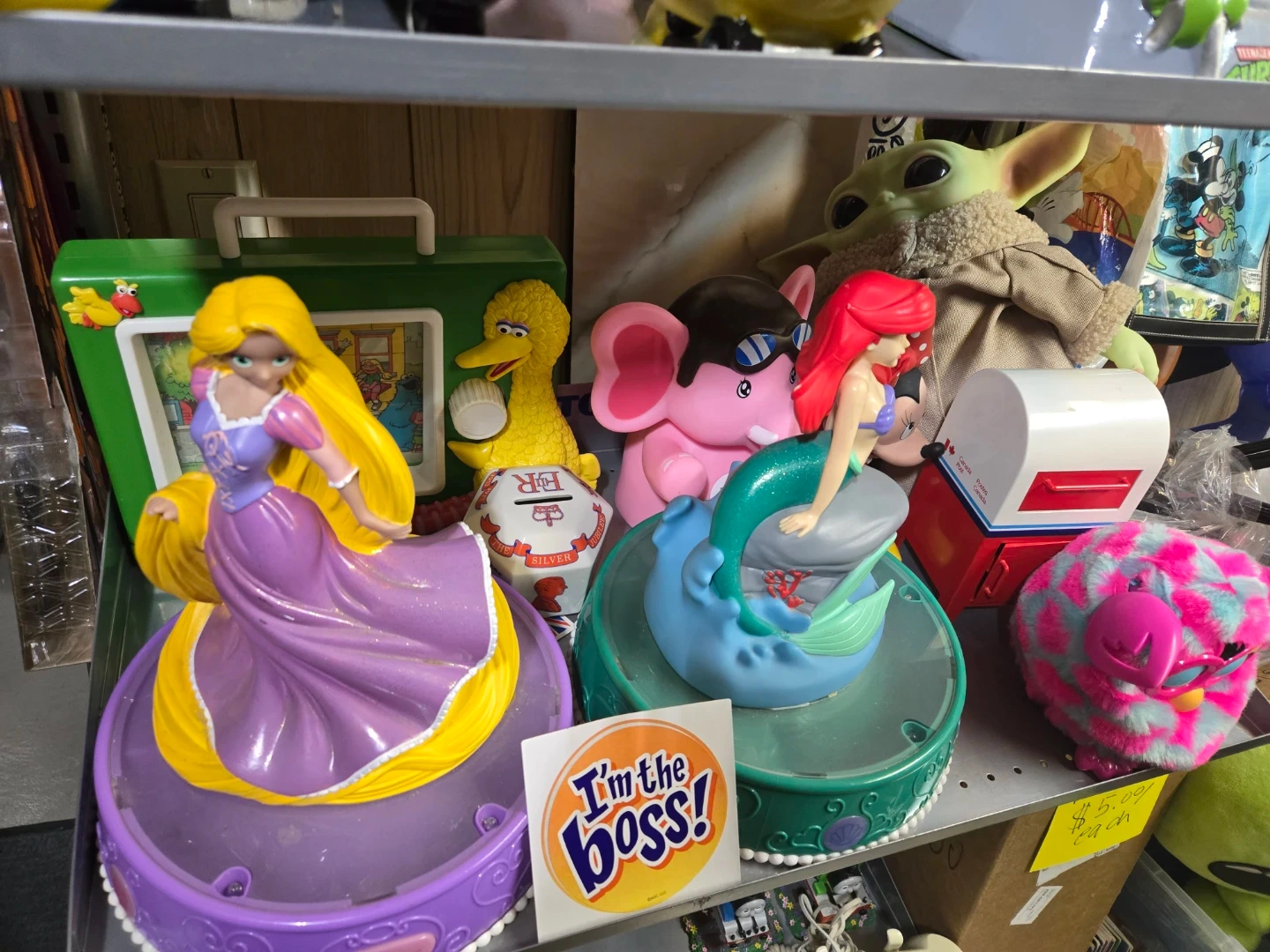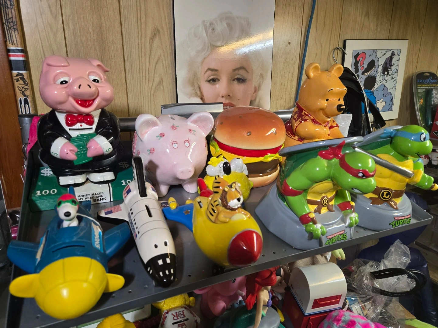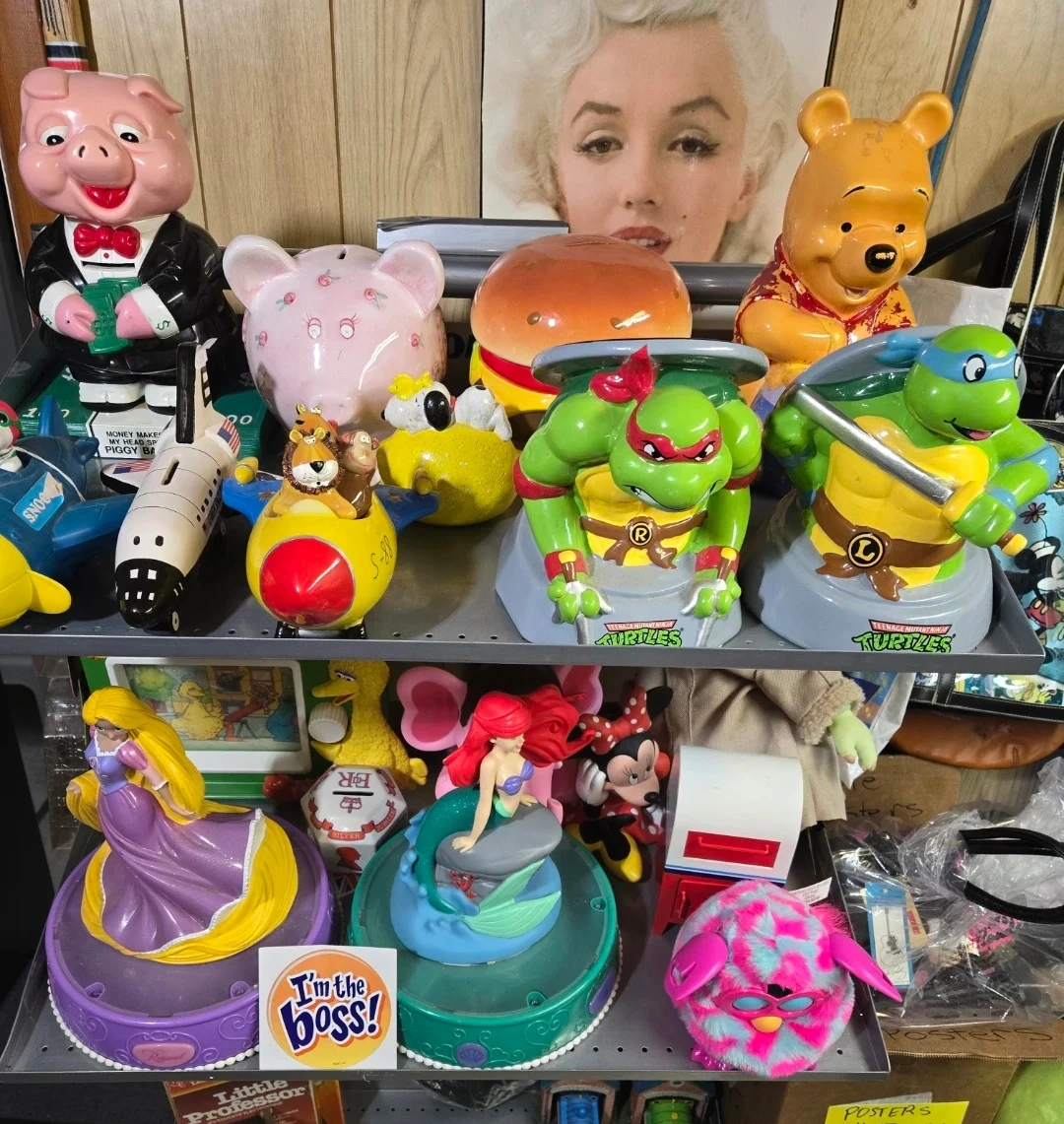 148A variety of decorative figurines and coin banks are available. These include character-themed banks like Teenage Mutant Ninja Turtles, Winnie the Pooh, and Disney princesses. There are also various salt and pepper shakers and other decorative items. $20each Or 400$ for Everything Works out to 10$ each on the shakers And 20$ on all the bigger piggy banks and ceramics