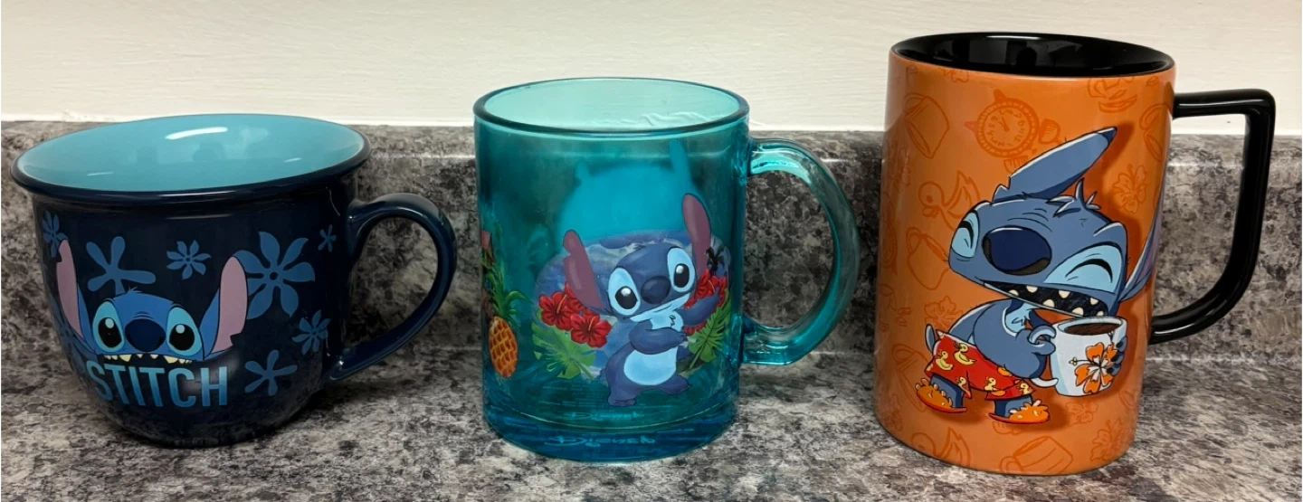 88Selling a collection of decorative mugs and glasses. There are wine glasses with a holly design, mugs featuring Stitch from Disney's Lilo & Stitch, Kona Brewing Co glasses, and mugs with Hawaiian and Disney themes. Perfect for adding a bit of fun to your drinkware collection! All as is. Available for pick up 11am to 5pm Info in last photo, phone to show size First 4 photos, $10.00 each Next 3 photos, $5.00 each Prices are firm, exact cash only