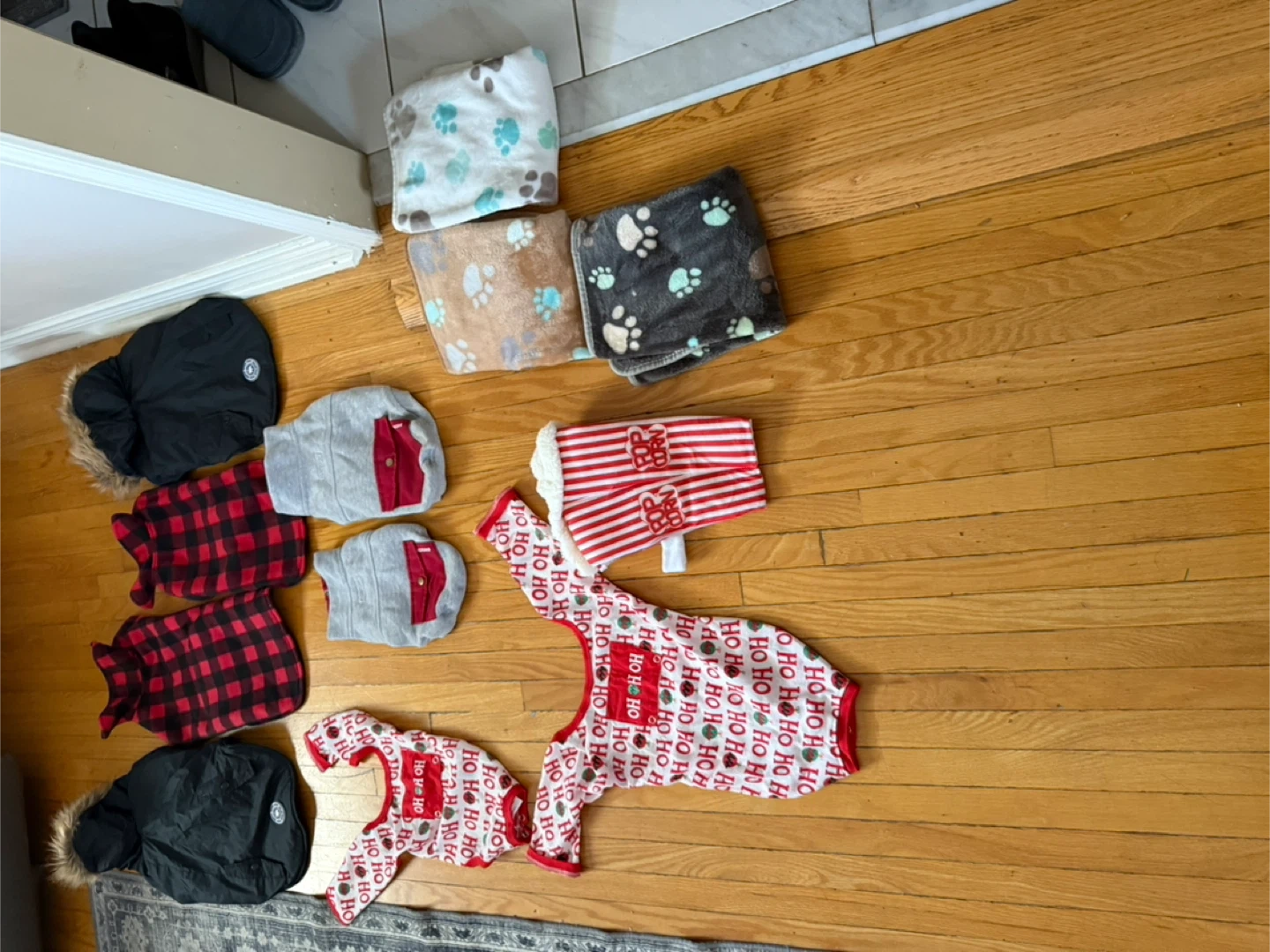 Selling a variety of dog clothes and a cozy blanket! There's a black winter coat with a furry hood, red and black plaid shirts, grey sweaters with red pockets, and festive holiday-themed outfits. The blanket has a cute paw print design. Keep your furry friend warm and stylish!
