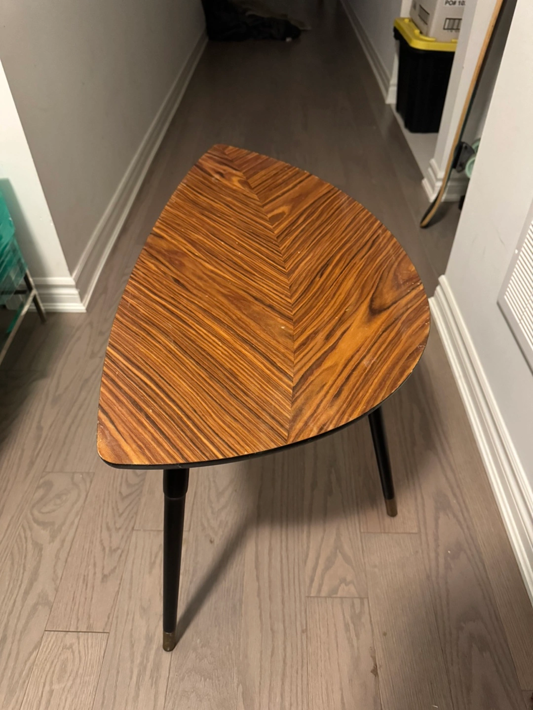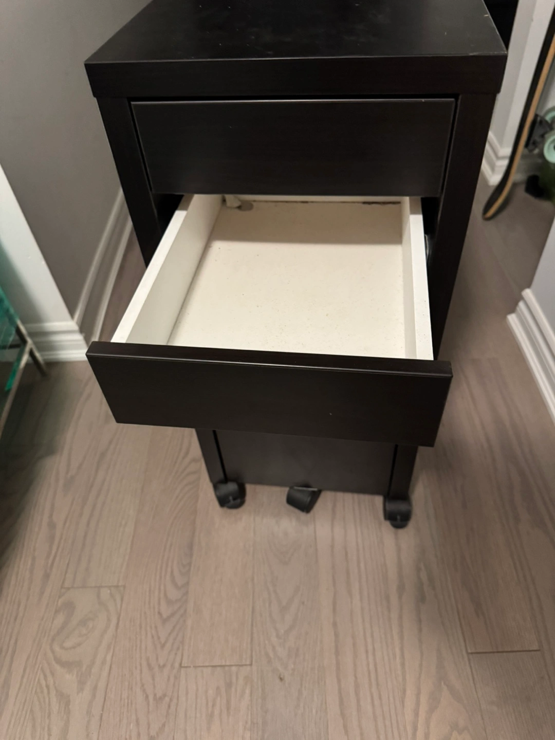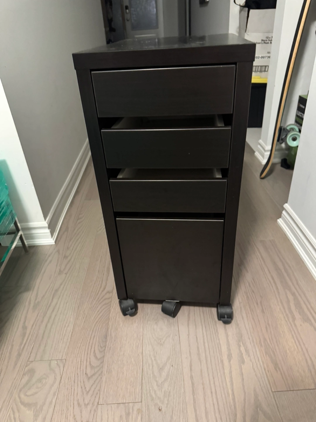 Selling a few pieces of furniture, including a unique side table with a wood grain top, a black rolling dresser with drawers, and a modern coffee table. All items are in good condition and ready for a new home! Perfect for adding some style and functionality to your space