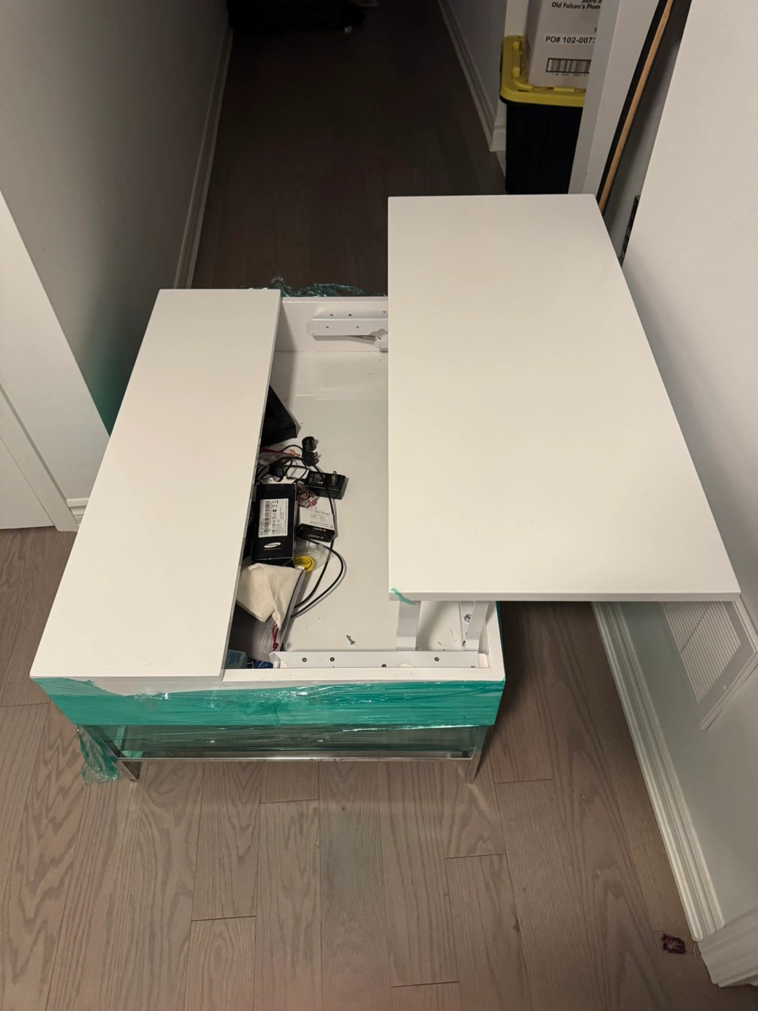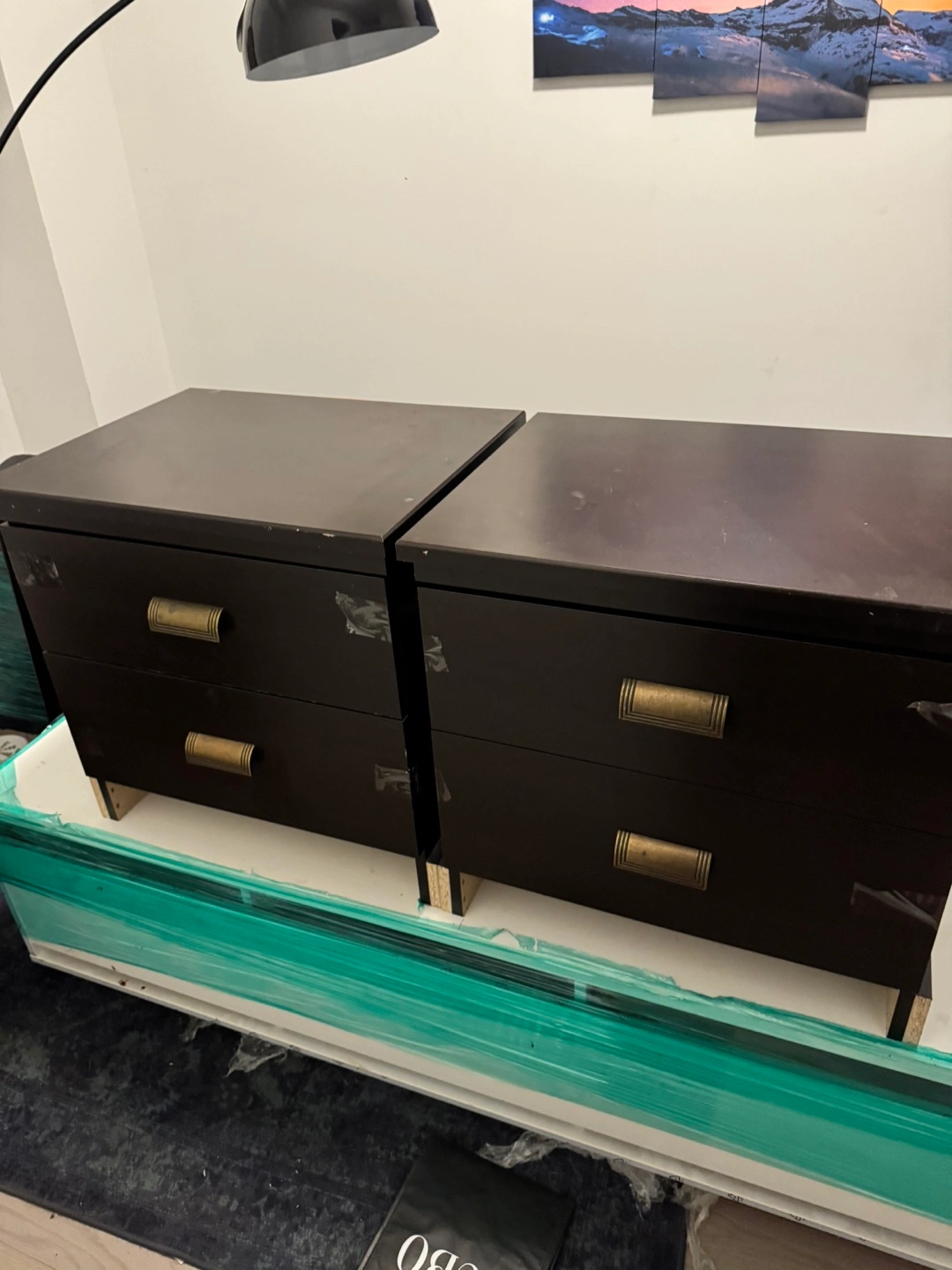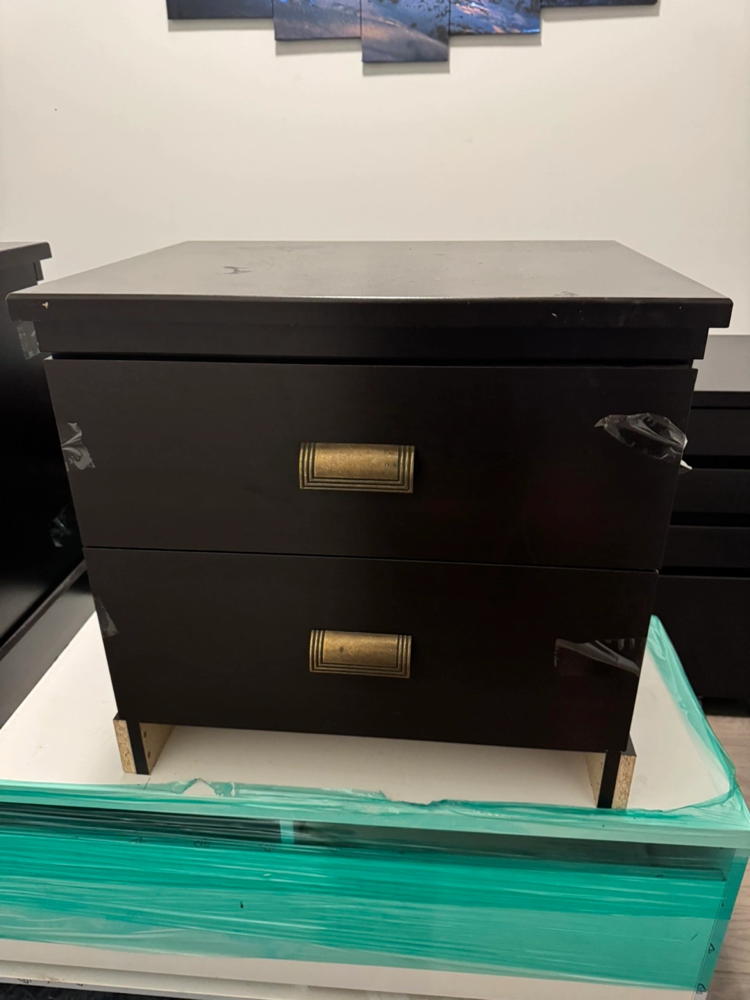 Selling a few pieces of furniture, including a unique side table with a wood grain top, a black rolling dresser with drawers, and a modern coffee table. All items are in good condition and ready for a new home! Perfect for adding some style and functionality to your space