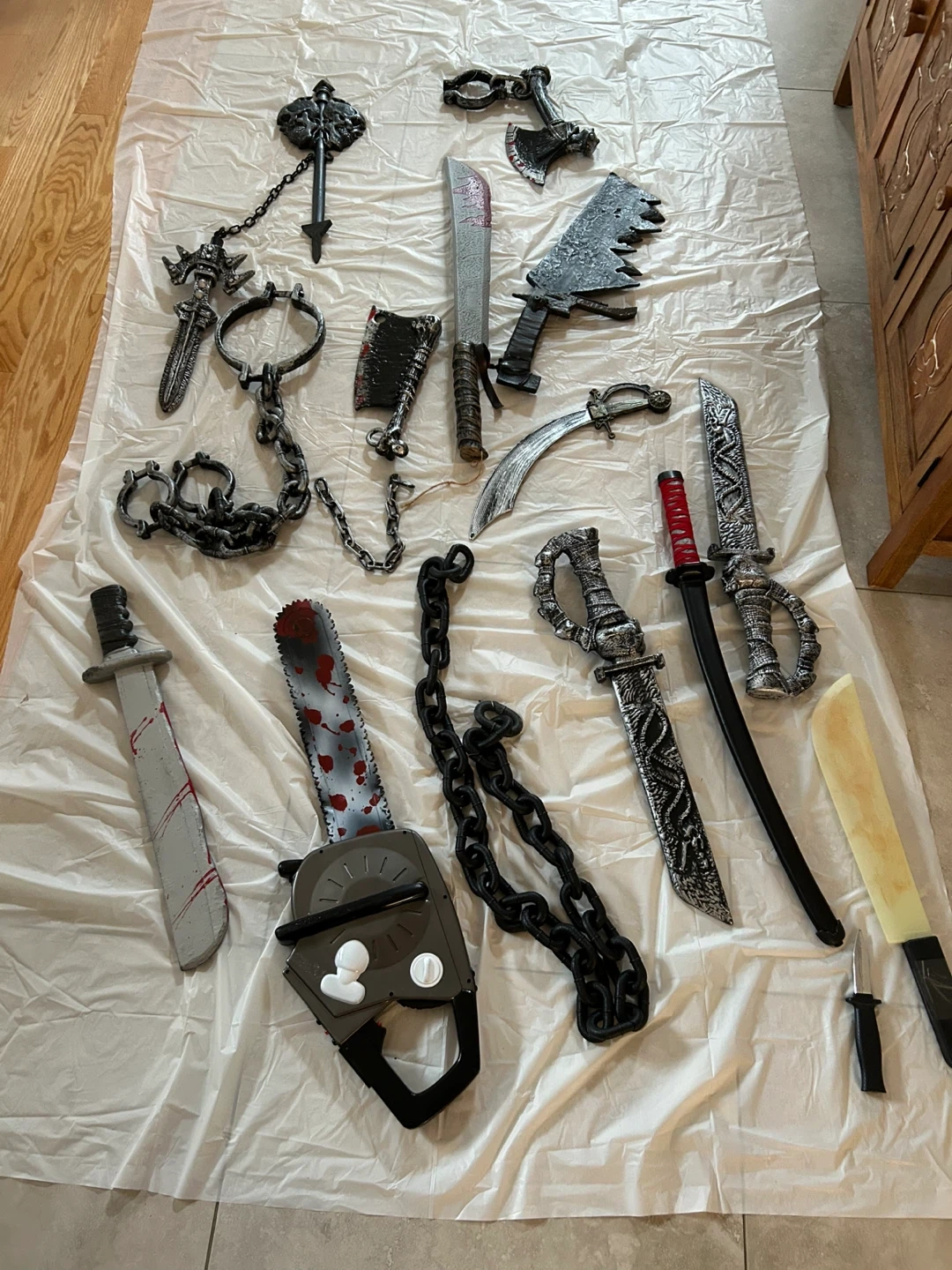 Selling a variety of Halloween costume weapons. Great for completing your spooky look this year! Includes swords, chains, and a chainsaw prop