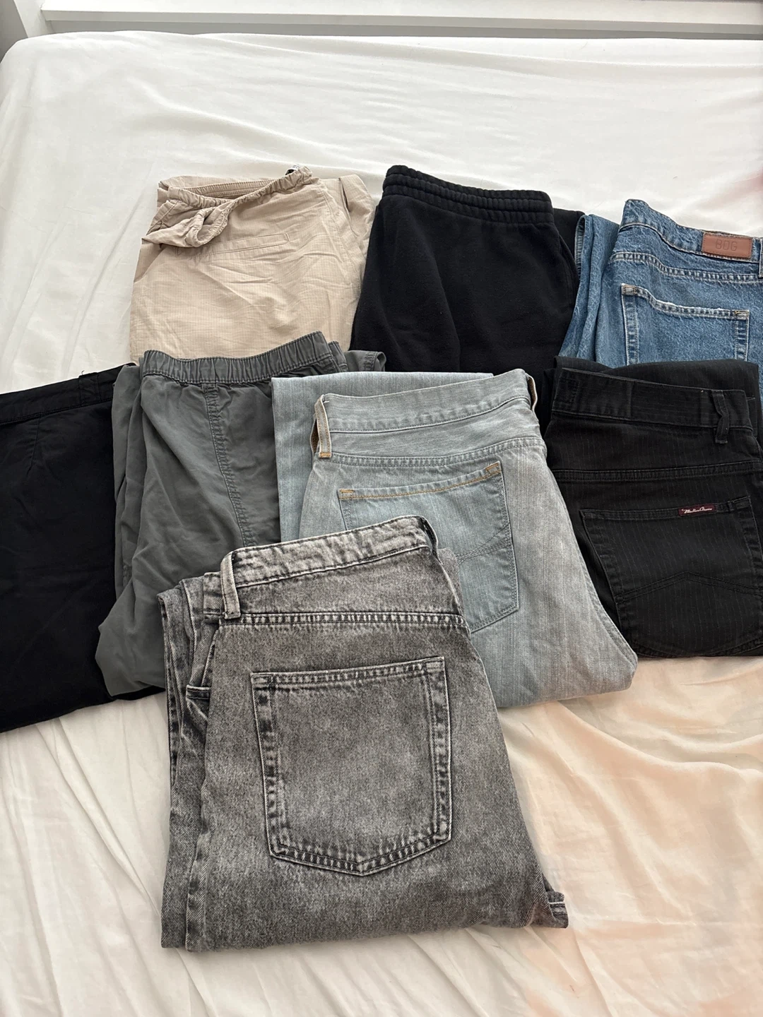 18all for 60 , if u want one specifically, message me Brand are zara, h&m , urban outfitters, gap, guess. styles are track pants, jeans, sweatpants, cargos