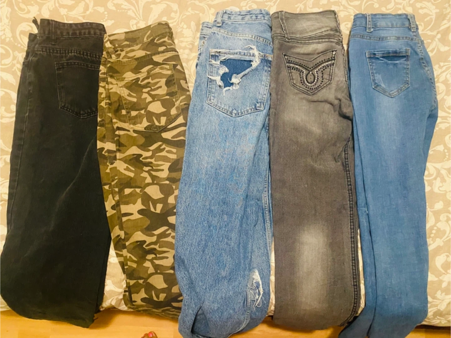 437Selling a collection of jeans in various styles and sizes. There's a mix of colours and designs, including black, camo, light wash, grey, and classic blue denim. Some have unique details, like embellished pockets or distressed elements. Perfect for adding variety to your wardrobe! Size: 4, 7, 6, 7 and 5