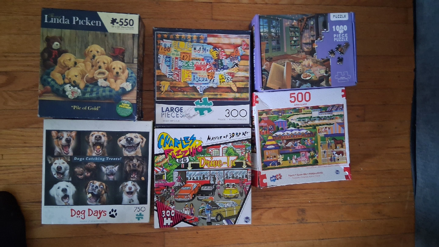65Selling a variety of jigsaw puzzles! - Linda Picken "Pile of Gold" 550 pieces - Buffalo Large Pieces Road Trip USA 300 pieces - Charles Fazzino Master of 3D Pop Art 300 pieces - Americana 500 pieces - And more! .$5 each