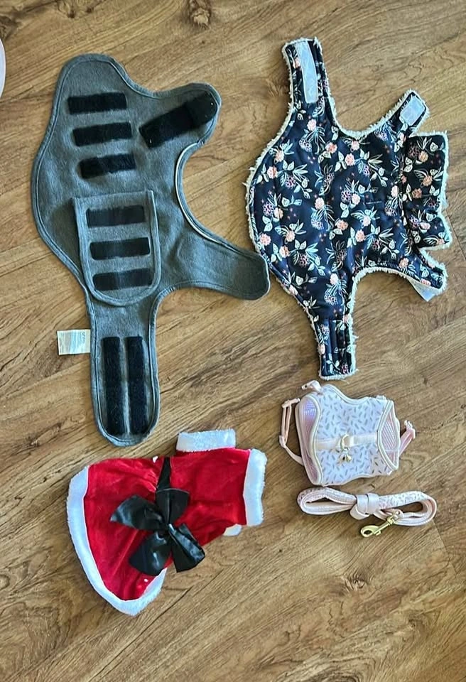 65All minimally used or never used by my cat and she outgrew all of it. will sell separately or take the whole lot for $15 Anxiety vest, size small Christmas dress, size xs Winter jacket, size xs Pick up in spruce grove