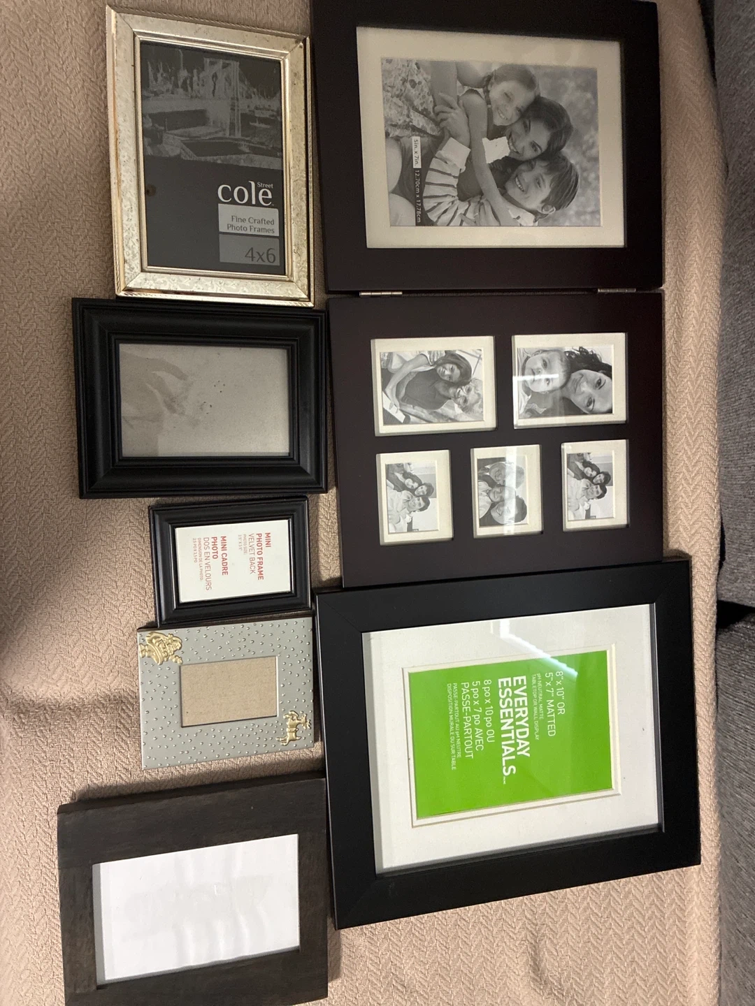 Selling a collection of picture frames in various styles and sizes. Great for displaying your favourite photos! There's a mix of materials and colours, perfect for any decor. From smaller frames to larger ones, you'll find something to suit your needs.