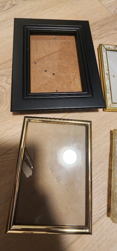 Selling a used set of 6 picture frames in various styles and colours! There's a black frame, a gold frame, and two other decorative frames. The tag on one of the frames shows it was originally $14.99 . They're perfect for displaying your favourite photos or artwork all 8$.