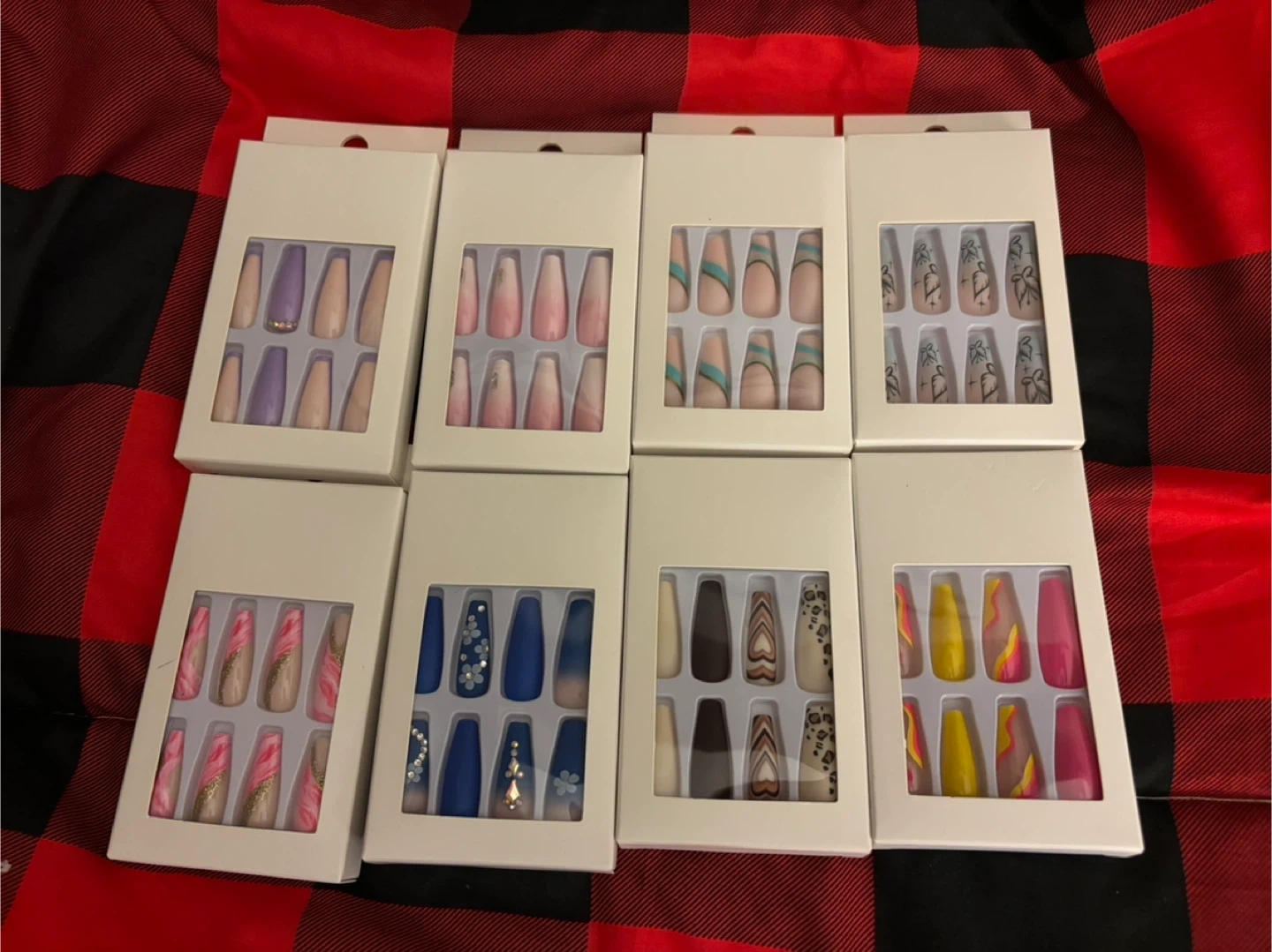 I have a variety of press-on nail sets available, all brand new in their boxes! There are different colours and designs to choose from, so you can find the perfect set to match your style. They're easy to apply and a fun way to switch up your look! $5.00 per box, $2.00 for the bagged ones