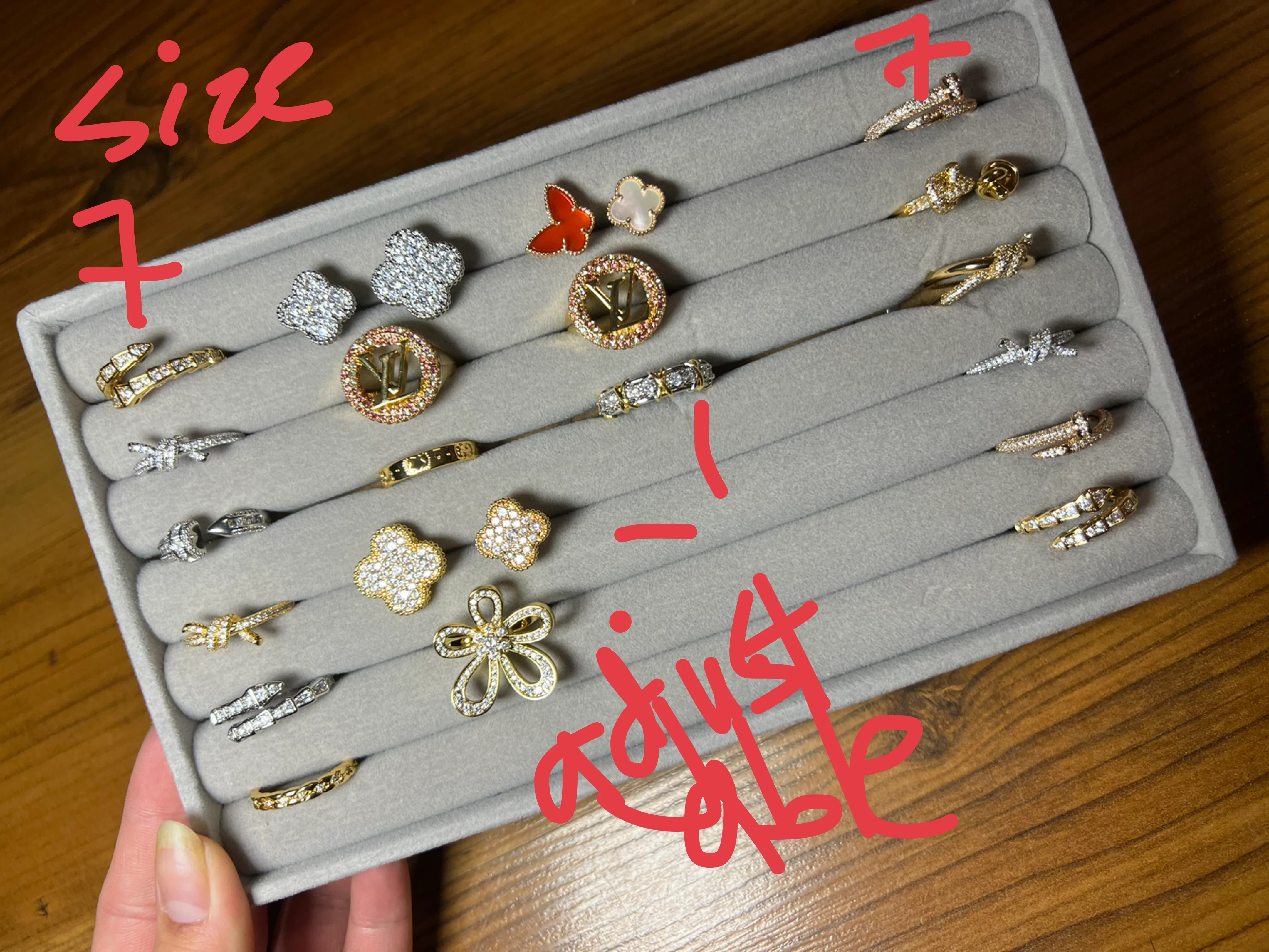 76Selling a collection of stainless steel assorted rings. Perfect for adding a bit of sparkle to your everyday look. Non tarnished. 1st and last column are size 7 Two middle column are adjustable. Prices may vary.