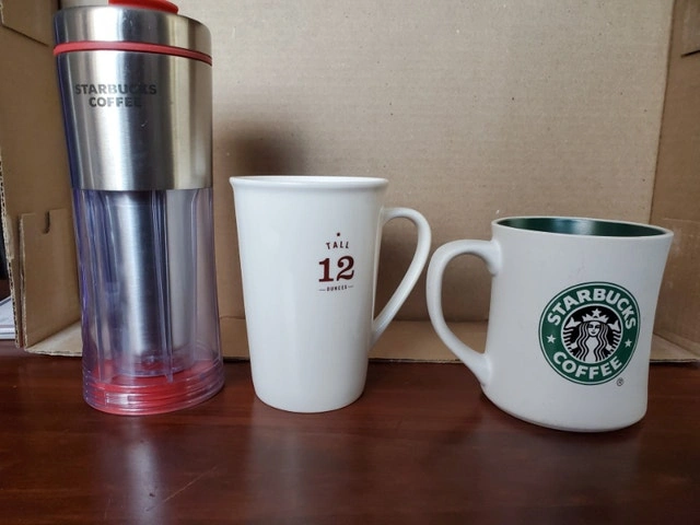 0Two Starbucks Coffee Mugs, $5.00 each, pick up only (the white mug, marked "12" has been sold). 1. Classic white mug with green logo and green interior SOLD - 2. Tall white mug 3. Travel cup - holds 10oz, about 8" tall, clear plastic, red accents, metal band Condition: Used - Good For Sale By: Owner