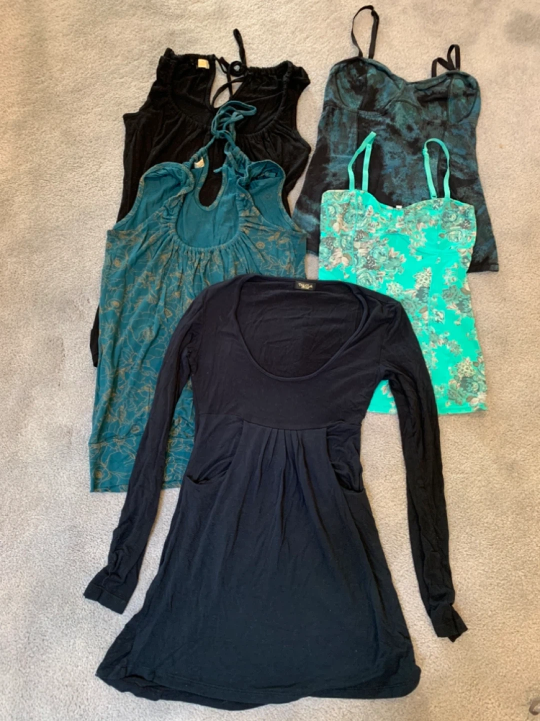 65Would like to sell as a bundle but will consider selling separately- minimum of 2 items. 1) Light green floral - XXS $5 2) Dark green with black - S $5 3) Emerald green floral with back tie - XXS $8 4) Black top with back tie - XXS $8 5) Black long sleeve with pockets - XXS $10 6) grey shorts- size 0 $10 $40 for all 6 items ! Meet up at Vancouver Marpole or Marine Drive locations.