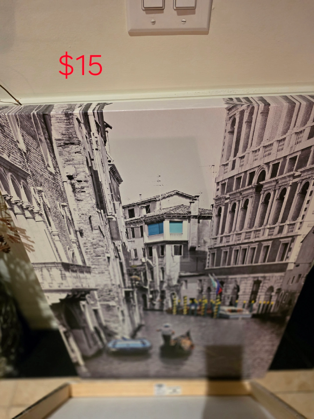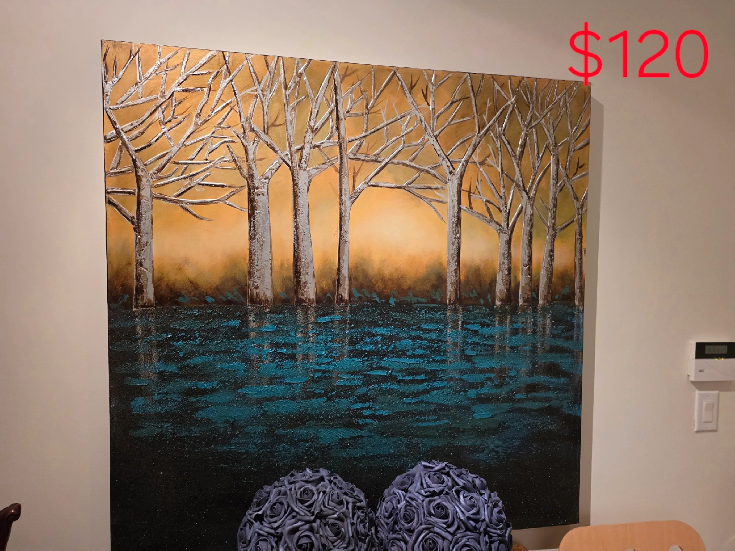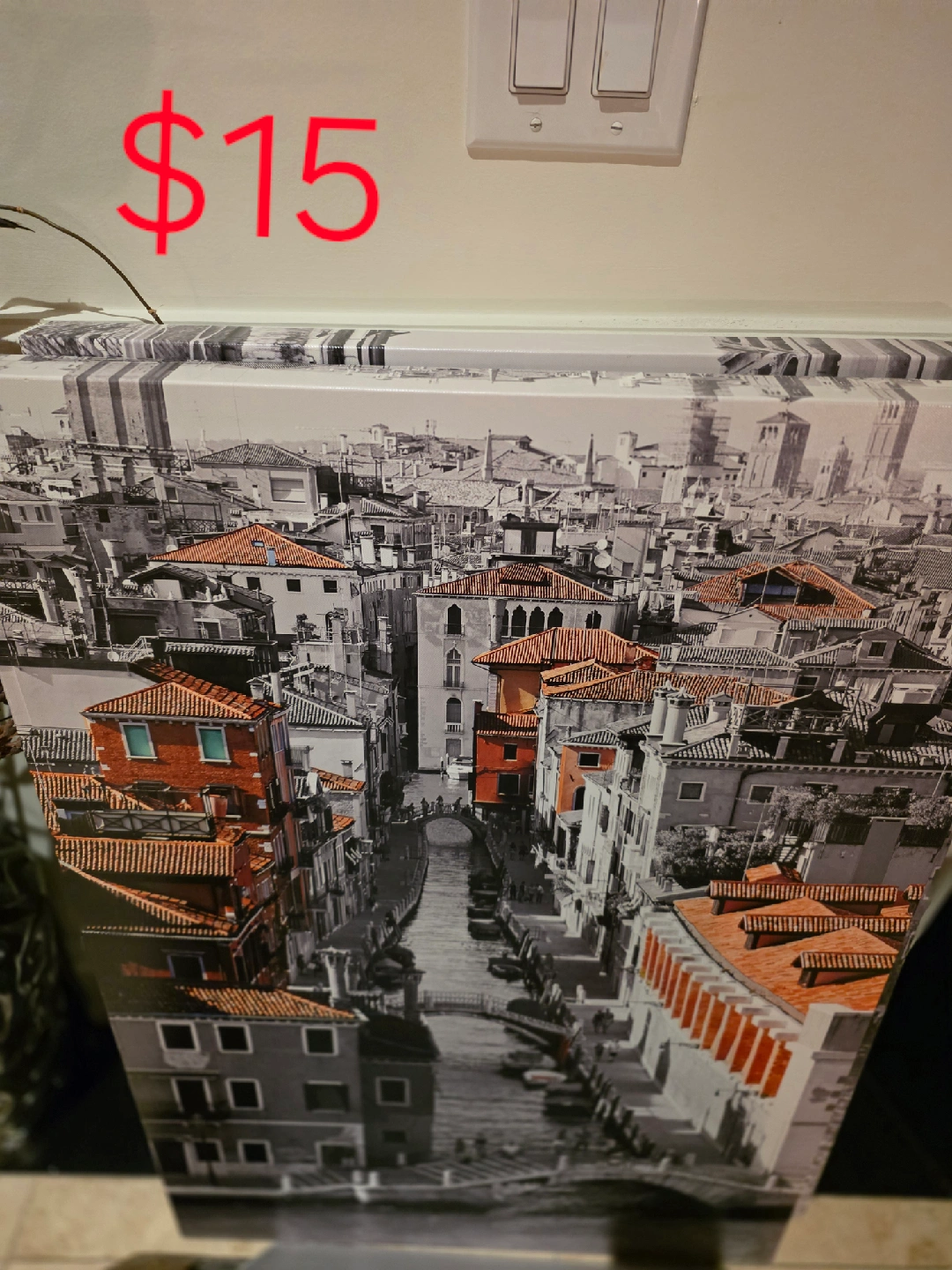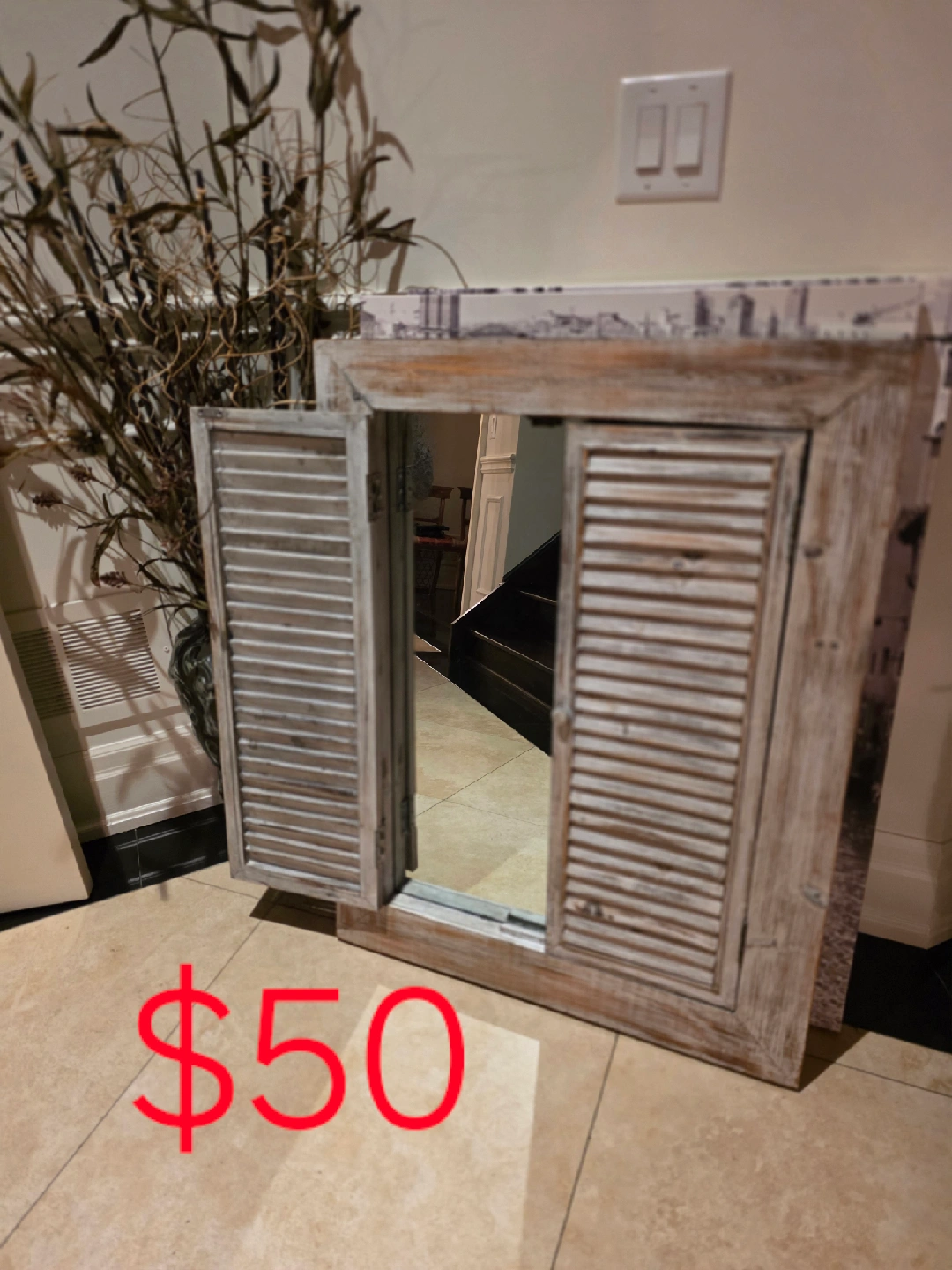 82Selling various pieces of wall art to spruce up your space! There's a black and white cityscape print, a mirror with shuttered doors, an abstract tree painting, another cityscape print, and a set of four panels with tree and bird designs
