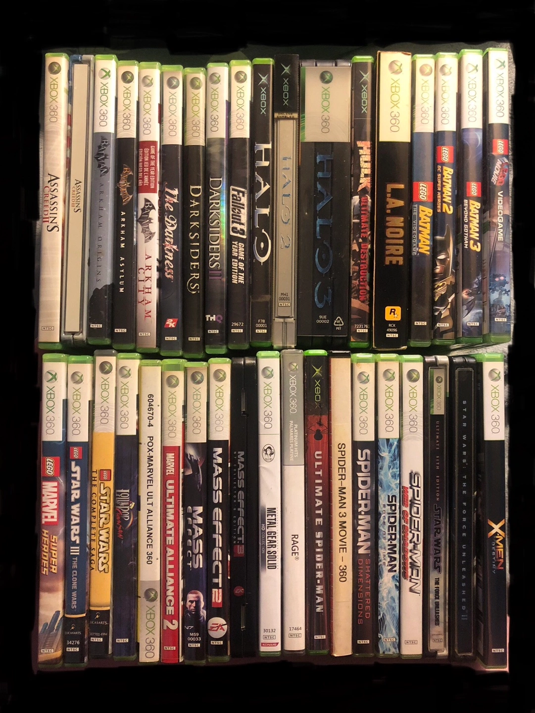 Assorted XBOX and 360 games Updaded June 12 2025 Prices per game listed below: Assassins Creed II -SOLD- Assassins Creed III steel book only $5 Batman Arkham Origins -SOLD- Batman Arkham Asylum -SOLD- Batman Arkham City GOTY edition $10 The Darkness $5 Darksiders $5 Darksiders II $5 Fallout 3 GOTY edition -SOLD- Ghostbusters the Video Game $5 Halo $5 Halo 2 Limited Edition $5 Halo 3 Limited Edition $10 Incredible Hulk Ultimate Destruction -SOLD- L.A. Noire Complete Edition $5 Lego Batman -SOLD- Lego Batman 2 DC Super Heroes $5 Lego Batman 3 Beyond Gotham $5 Lego Movie the Video Game $5 Lego Marvel Super Heroes -SOLD- Lego Star Wars 3 The Clone Wars $5 Lego Star Wars The Complete Saga $5 Lollipop Chainsaw $40 Marvel Ultimate Alliance (EB case no manual) $5 Marvel Ultimate Alliance 2 -SOLD- Mass Effect $5 Mass Effect 2 $5 Mass Effect 3 Collectors Edition $5 Metal Gear Solid HD Collection -SOLD- Ninja Gaiden $5 Rage Anarchy platinum $5 Red Dead 1 GOTY edition 360/one -SOLD- Ultimate Spider-Man -SOLD- Spider-Man 3 Movie Game (EB case) -SOLD- Spider-Man Shattered Dimensions $40 Spider-Man Edge of Time $40 Spider-Man Web of Shadows -SOLD- Star Wars Force Unleashed Ult Sith Edition $10 Star Wars Force Unleashed II Ultimate $10 Star Wars KOTOR $5 Star Wars KOTOR II $5 X-Men Destiny $5 XBOX Mag disks -SOLD- All games tested and include manual when one was included unless otherwise noted Curbside pickup or you pay shipping Buy 3 items or more for a discount