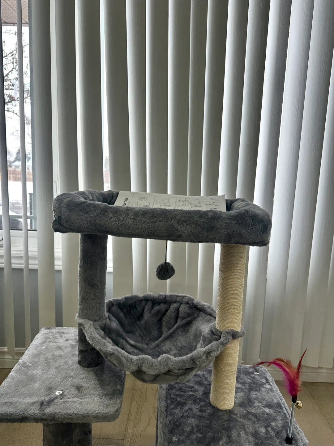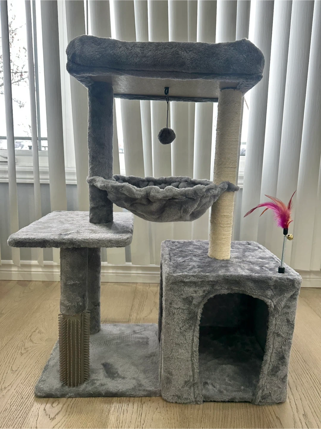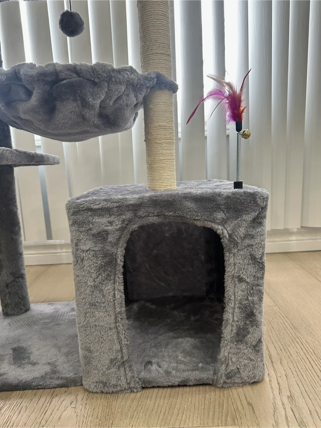 This multi-level cat tree condo is covered in soft grey plush fabric. It features a hammock, a scratching post, and a hideaway cubby for your feline friend. Includes a dangling toy with feathers and a bell. It's perfect for cats to climb, play, and nap!