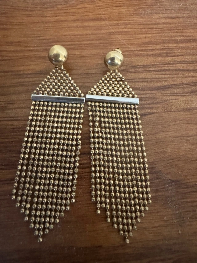 A pair of used 14k gold earrings crafted in Italy, featuring a unique beaded tassel design. These earrings add a touch of elegance and distinctive flair to any ensemble. Metal: 14k Gold. Origin: Italy. Style: Beaded Tassel. Asking $750. Condition: Used - Good. Payment accepted: Cashless payment, Cash.
