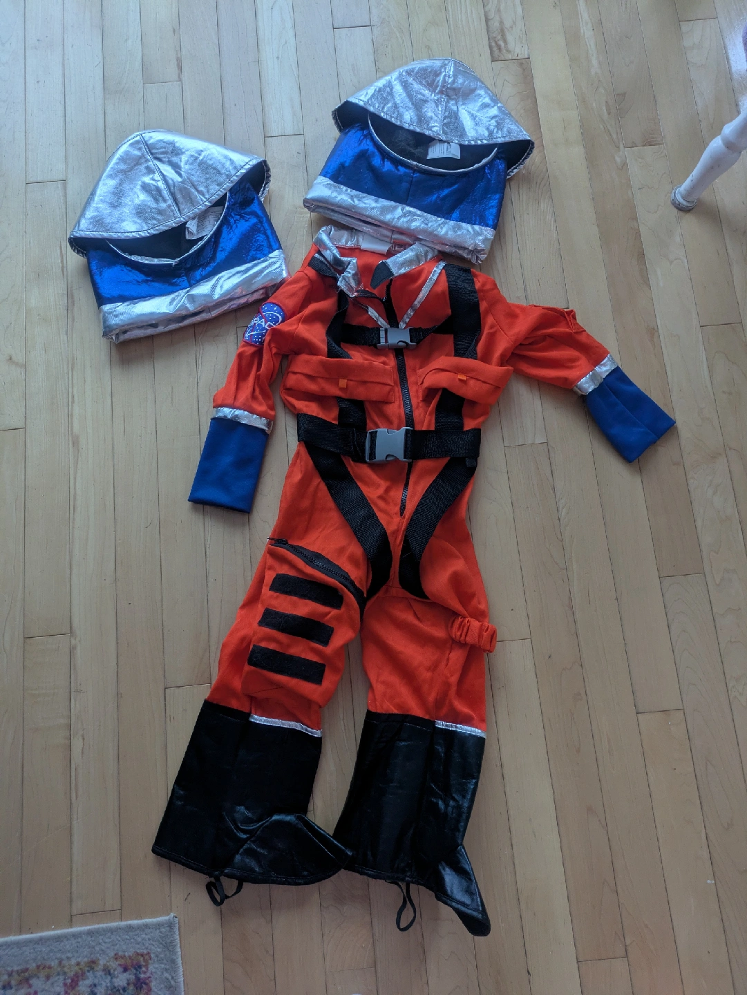 25Selling an astronaut costume! It's orange and black with some blue and silver accents. Includes the jumpsuit and two hoods