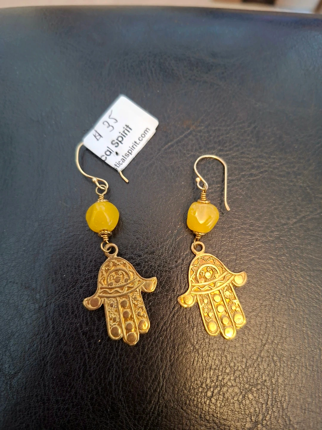 These brass earrings feature Hamsa hand pendants with yellow stone beads. They're from Mystical Spirit and perfect for adding a touch of spiritual flair to your look!