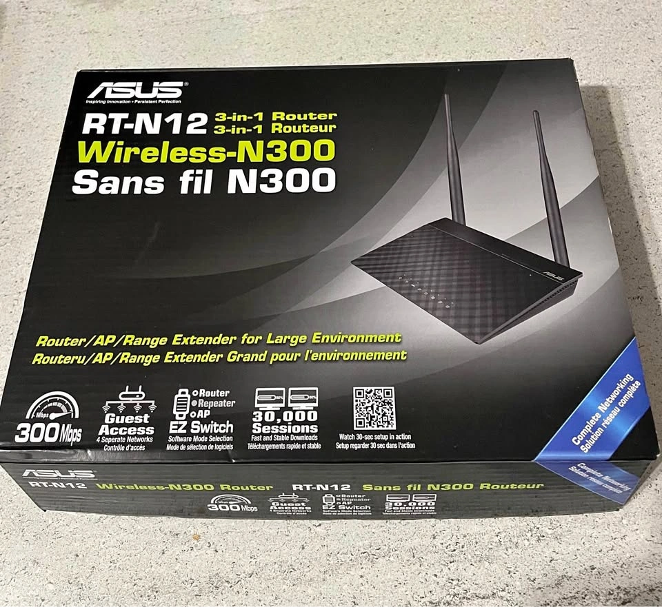 10Like new in original box. The RT-N12 creates an extended coverage area with advanced wireless performance, making it ideal for streaming HD video, placing VoIP calls and online gaming. Includes: - Multiple 3-in-1 Router/Access Point /Range Extender wireless modes - Two detachable 5dBi antennas for more powerful and wider coverage - 4 SSIDs help manage bandwidth allocation and access control - Powerful Online Multitasking at up to 30,000 Data Sessions