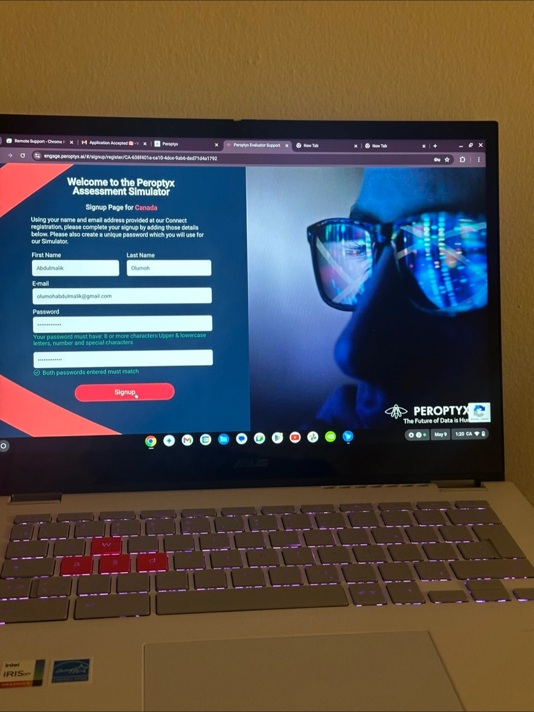 Slim laptop, backlit keyboard. Chrome OS operating system. Intel Iris Xe Graphics.