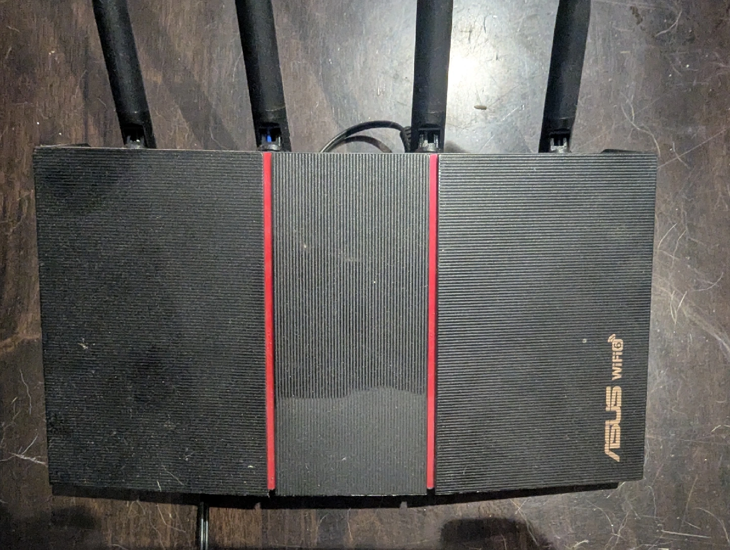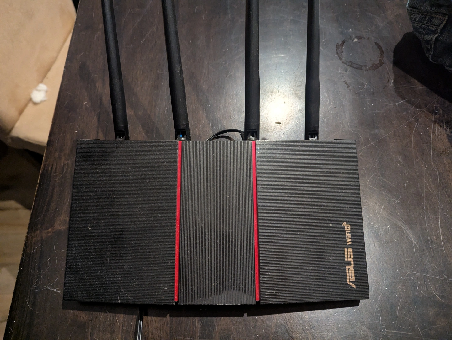Selling an ASUS WiFi router in perfect working condition. It features a black design with red accents and four antennas for enhanced connectivity. Perfect for upgrading your home network!