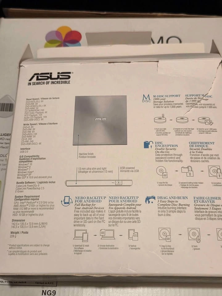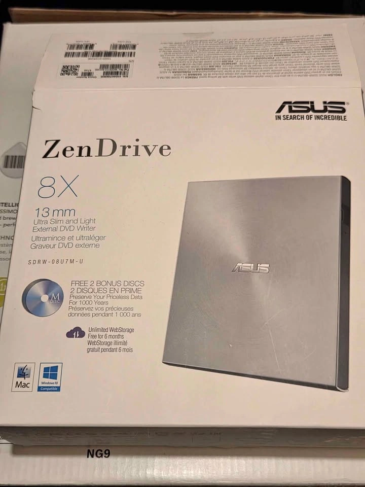 Brand new ASUS ZenDrive external DVD/CD writer. Ultra-slim and lightweight (13mm) USB-powered, no extra adapter needed Compatible with Windows & Mac Supports M-Disc technology to preserve data for up to 1,000 years Comes with bonus discs + software Perfect for laptops without DVD drives or for backing up files.